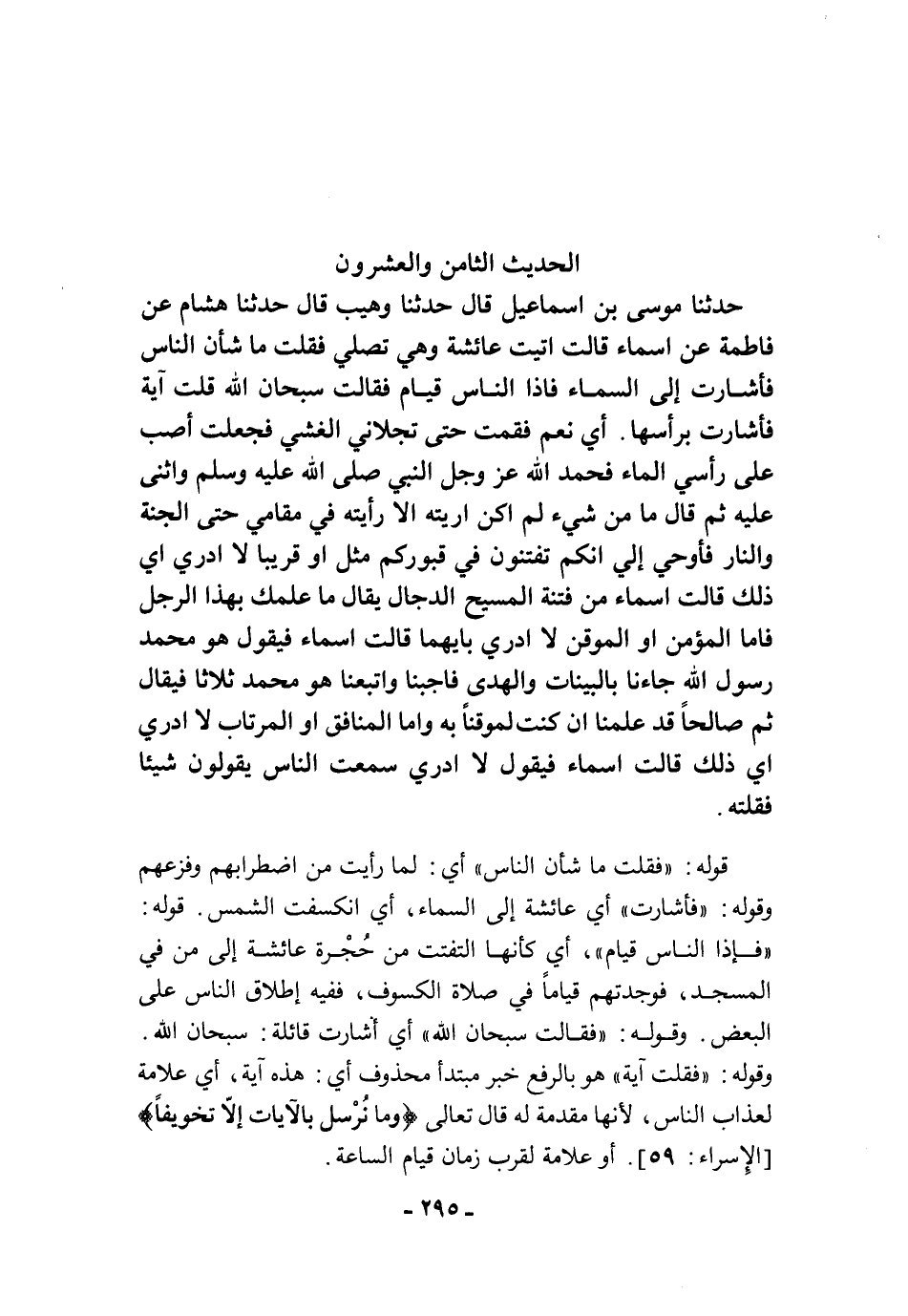 حَدَّثَنَا مُوسَى بْنُ إِسْمَاعِيلَ قَالَ: حَدَّثَنَا وُهَيْبٌ قَالَ: حَدَّثَنَا هِشَامٌ عَنْ فَاطِمَةَ عَنْ أَسْمَاءَ قَالَتْ: أَتَيْتُ عَائِشَةَ وَهِىَ تُصَلِّي فَقُلْتُ: مَا شَأْنُ النَّاسِ فَأَشَارَتْ إِلَى السَّمَاءِ، فَإِذَا النَّاسُ قِيَامٌ، فَقَالَتْ: سُبْحَانَ اللَّهِ. قُلْتُ آيَةٌ فَأَشَارَتْ بِرَأْسِهَا، أَىْ نَعَمْ، فَقُمْتُ حَتَّى تَجَلاَّنِى الْغَشْيُ، فَجَعَلْتُ أَصُبُّ عَلَى رَأْسِي الْمَاءَ، فَحَمِدَ اللَّهَ عَزَّ وَجَلَّ النَّبِيُّ -صلى الله عليه وسلم- وَأَثْنَى عَلَيْهِ، ثُمَّ قَالَ: "مَا مِنْ شَيْءٍ لَمْ أَكُنْ أُرِيتُهُ إِلاَّ رَأَيْتُهُ فِى مَقَامِي حَتَّى الْجَنَّةَ وَالنَّارَ، فَأُوحِيَ إِلَيَّ أَنَّكُمْ تُفْتَنُونَ فِى قُبُورِكُمْ، مِثْلَ -أَوْ قَرِيبًا لاَ أَدْرِى أَيَّ ذَلِكَ قَالَتْ أَسْمَاءُ- مِنْ فِتْنَةِ الْمَسِيحِ الدَّجَّالِ، يُقَالُ مَا عِلْمُكَ بِهَذَا الرَّجُلِ فَأَمَّا الْمُؤْمِنُ -أَوِ الْمُوقِنُ لاَ أَدْرِي بِأَيِّهِمَا قَالَتْ أَسْمَاءُ- فَيَقُولُ هُوَ مُحَمَّدٌ رَسُولُ اللَّهِ جَاءَنَا بِالْبَيِّنَاتِ وَالْهُدَى، فَأَجَبْنَا وَاتَّبَعْنَا، هُوَ مُحَمَّدٌ. ثَلاَثًا، فَيُقَالُ ثمْ صَالِحًا، قَدْ عَلِمْنَا إِنْ كُنْتَ لَمُوقِنًا بِهِ، وَأَمَّا الْمُنَافِقُ -أَوِ الْمُرْتَابُ لاَ أَدْرِي أَيَّ ذَلِكَ قَالَتْ أَسْمَاءُ- فَيَقُولُ لاَ أَدْرِي، سَمِعْتُ النَّاسَ يَقُولُونَ شَيْئًا فَقُلْتُهُ".