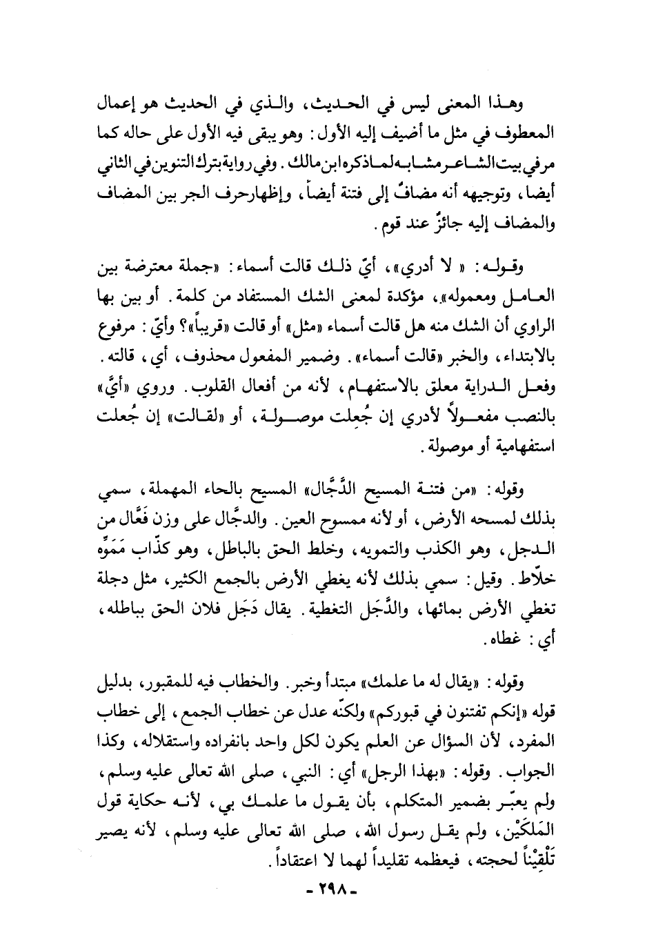وهذا المعنى ليس في الحديث، والذي في الحديث هو إعمال المعطوف في مثل ما أضيف إليه الأول: وهو يبقى فيه الأول على حاله كما مر في بيت الشاعر مشابه لما ذكره ابن مالك. وفي رواية بترك التنوين في الثاني أيضًا، وتوجيهه أنه مضافٌ إلى فتنة أيضا، وإظهار حرف الجر بين المضاف والمضاف إليه جائزٌ عند قوم.