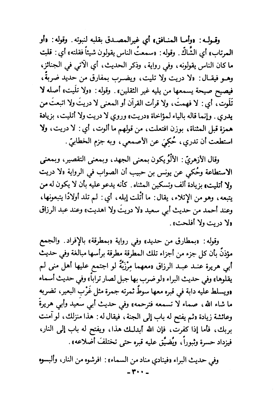 وقوله: "واما المنافق" أي غير المصدق بقلبه لنبوته. وقوله: "أو المرتاب" أي الشَّاكّ. وقوله: "سمعتُ الناس يقولون شيئًا فقلته" أي: قلت ما كان الناس يقولونه، وفي رواية، وذكر الحديث، أي الآتي في الجنائز، وهو فيقال: "لا دريت ولا تليت، ويضرب بمفارق من حديد ضربةً، فيصيح صيحة يسمعها من يليه غير الثقلين". وقوله: "ولا تلَيت" أصله لا تَلَوت، أي: لا فهمتَ، ولا قرأت القرآن أو المعنى لا دريتَ ولا اتبعتَ من يدري. وإنما قاله بالياء لمؤاخاة "دريت" وروي لا دريت ولا أتليت، بزيادة همزة قبل المثناة، بوزن افتعلت، من قولهم ما ألوت، أي: لا دريت، ولا استطعت أن تدري، حُكِيَ عن الأصمعي، وبه جزم الخطابيّ.