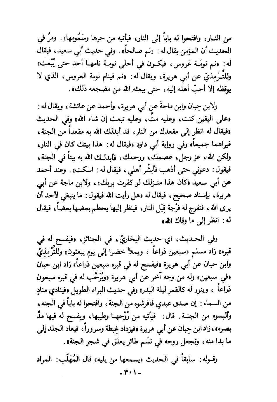 وفي الحديث، أي حديث البخاريّ، في الجنائز، "فيفسح له في قبره" زاد مسلم "سبعين ذراعًا، ويملأ خضرا إلى يوم يبعثون" وللتَّرْمِذِيّ وابن حبان عن أبي هريرة "فيفسح له في قبره سبعين ذراعًا" زاد ابن حبان "في سبعين" وله من وجه آخر عن أبي هريرة "ويُرَحَّب له في قبره سبعون ذراعًا، وينور له كالقمر ليلة البدر" وفي حديث البراء الطويل "فينادي منادٍ من السماء: إن صدق عبدي فافرشوه من الجنة، وافتحوا له بابًا في الجنه، وألبسوه من الجنة. قال: فيأتيه من رُوْحها وطيبها، ويفسح له فيها مدَّ بصره"، زاد ابن حِبان عن أبي هريرة "فيزداد غِبطة وسرورًا، فيعاد الجلد إلى ما بدا منه، وتجعل روحه في نسَم طائر يعلق في شجر الجنة".