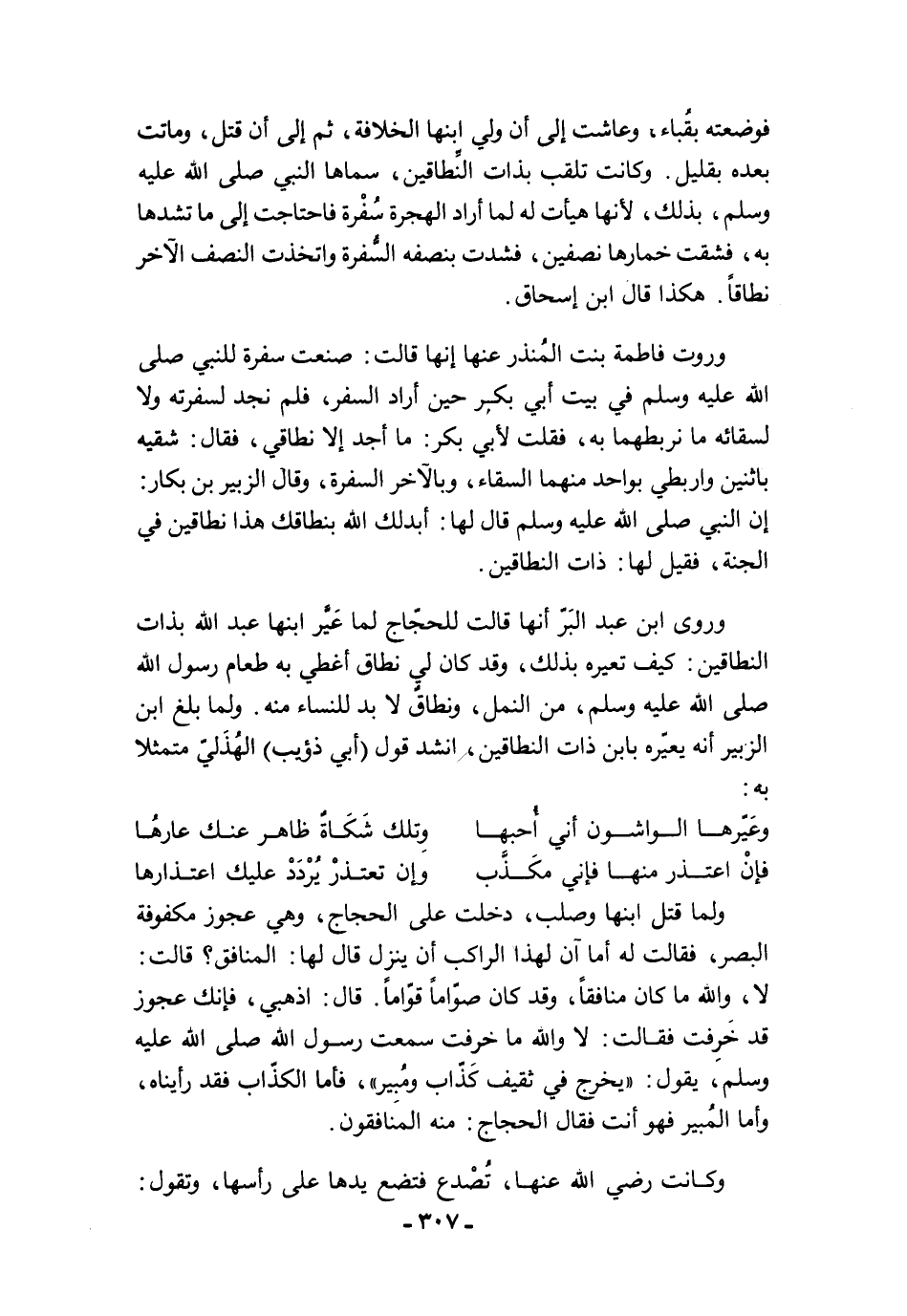 فوضعته بقُباء، وعاشت إلى أن ولي ابنها الخلافة، ثم إلى أن قتل، وماتت بعده بقليل. وكانت تلقب بذات النَّطاقين، سماها النبي صلى الله عليه وسلم، بذلك؛ لأنها هيأت له لما أراد الهجرة سُفْرة فاحتاجت إلى ما تشدها به، فشقت خمارها نصفين، فشدت بنصفه السفرة واتخذت النصف الآخر نطاقًا. هكذا قال ابن إسحاق.