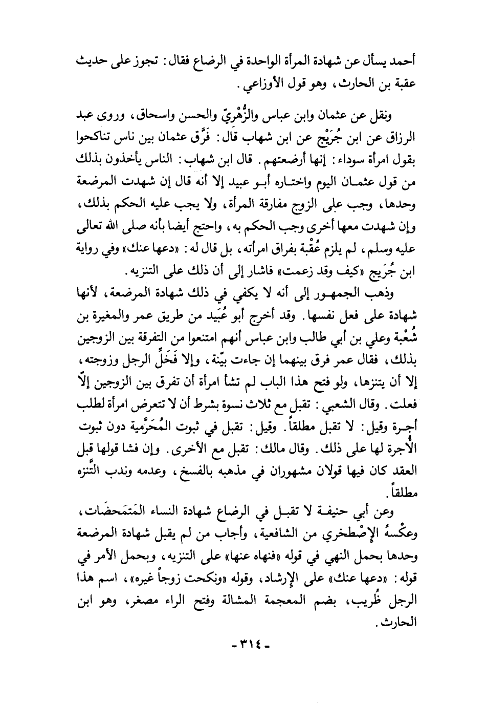 ونقل عن عثمان وابن عباس والزُّهْرِيّ والحسن وإسحاق، وروى عبد الرزاق عن ابن جُرَيْج عن ابن شهاب قال: فَرَّق عثمان بين ناس تناكحوا بقول امرأة سوداء: إنها أرضعتهم. قال ابن شهاب: الناس يأخذون بذلك من قول عثمان اليوم واختاره أبو عبيد إلا أنه قال إن شهدت المرضعة وحدها، وجب على الزوج مفارقة المرأة، ولا يجب عليه الحكم بذلك، وإن شهدت معها أخرى وجب الحكم به، واحتج أيضًا بأنه صلى الله تعالى عليه وسلم، لم يلزم عُقْبة بفراق امرأته، بل قال له: "دعها عنك" وفي رواية ابن جُرَيج "كيف وقد زعمت" فأشار إلى أن ذلك على التنزيه.