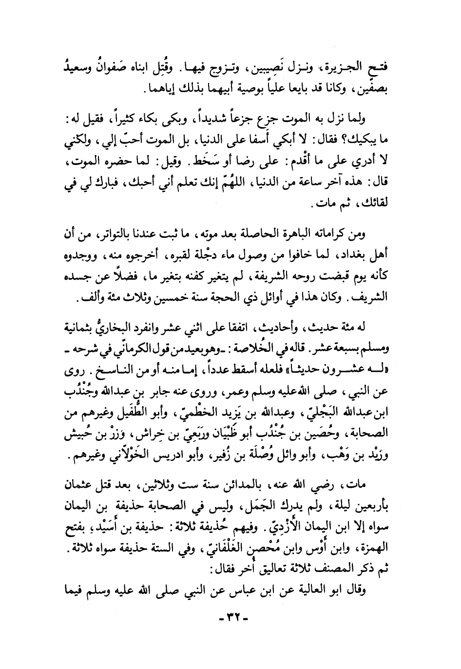 مات، رضي الله عنه، بالمدائن سنة ست وثلاثين، بعد قتل عثمان بأربعين ليلة، ولم يدرك الجَمَل، وليس في الصحابة حذيفة بن اليمان سواه إلا ابن اليمان الأَزْدِيّ. وفيهم حُذيفة ثلاثة: حذيفة بن أَسَيْد، بفتح الهمزة، وابن أَوْس وابن مُحْصن الغَلْفَانيّ، وفي الستة حذيفة سواه ثلاثة.