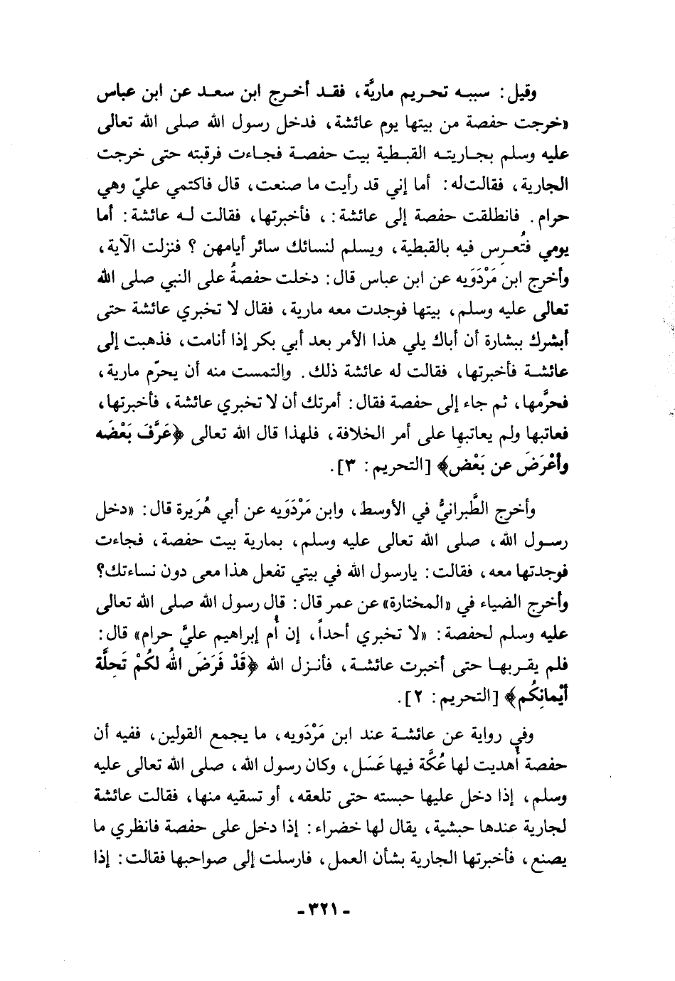 وأخرج الطَّبرانيُّ في الأوسط, وابن مَرْدَوَيه عن أبي هُرَيرة قال: "دخل رسول الله، صلى الله تعالى عليه وسلم، بمارية بيت حفصة، فجاءت فوجدتها معه، فقالت: يا رسول الله في بيتي تفعل هذا معى دون نساءتك؟ وأخرج الضياء في "المختارة" عن عمر قال: قال رسول الله صلى الله تعالى عليه وسلم لحفصة: "لا تخبري أحدًا، إن أُم إبراهيِم عليَّ حرام" قال: فلم يقربها حتى أخبرت عائشة، فأنزل الله {قَدْ فَرَضَ اللَّهُ لَكُمْ تَحِلَّةَ أَيْمَانِكُمْ} [التحريم: 2].