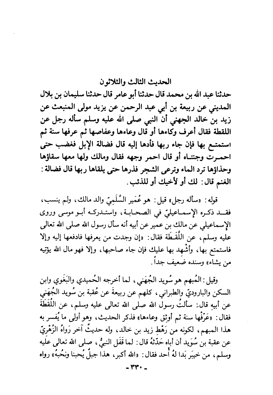 حَدَّثَنَا عَبْدُ اللَّهِ بْنُ مُحَمَّدٍ قَالَ حَدَّثَنَا أَبُو عَامِرٍ قَالَ حَدَّثَنَا سُلَيْمَانُ بْنُ بِلاَلٍ الْمَدِينِيُّ عَنْ رَبِيعَةَ بْنِ أَبِي عَبْدِ الرَّحْمَنِ عَنْ يَزِيدَ مَوْلَى الْمُنْبَعِثِ عَنْ زَيْدِ بْنِ خَالِدٍ الْجُهَنِىِّ أَنَّ النَّبِيَّ -صلى الله عليه وسلم- سَأَلَهُ رَجُلٌ عَنِ اللُّقَطَةِ فَقَالَ: "أعْرِفْ وِكَاءَهَا -أَوْ قَالَ وِعَاءَهَا- وَعِفَاصَهَا، ثُمَّ عَرِّفْهَا سَنَةً، ثُمَّ اسْتَمْتِعْ بِهَا، فَإِنْ جَاءَ رَبُّهَا فَأَدِّهَا إِلَيْهِ". قَالَ فَضَالَّةُ الإِبِلِ فَغَضِبَ حَتَّى احْمَرَّتْ وَجْنَتَاهُ -أَوْ قَالَ احْمَرَّ وَجْهُهُ- فَقَالَ: "وَمَا لَكَ وَلَهَا مَعَهَا سِقَاؤُهَا وَحِذَاؤُهَا، تَرِدُ الْمَاءَ، وَتَرْعَى الشَّجَرَ، فَذَرْهَا حَتَّى يَلْقَاهَا رَبُّهَا". قَالَ فَضَالَّةُ الْغَنَمِ قَالَ: "لَكَ أَوْ لأَخِيكَ أَوْ لِلذِّئْبِ".
