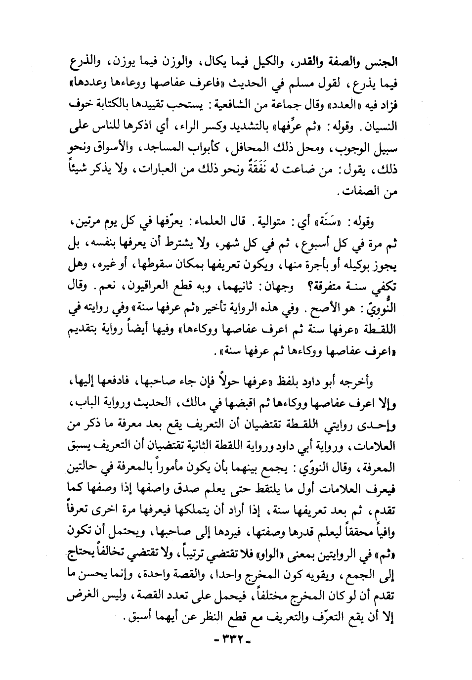 الجنس والصفة والقدر، والكيل فيما يكال، والوزن فيما يوزن، والذرع فيما يذرع، لقول مسلم في الحديث "فاعرف عفاصها ووعاءها وعددها" فزاد فيه، "العدد" وقال جماعة من الشافعية: يستحب تقييدها بالكتابة خوف النسيان. وقوله: "ثم عرِّفها" بالتشديد وكسر الراء، أي اذكرها للناس على سبيل الوجوب، ومحل ذلك المحافل، كأبواب المساجد، والأسواق ونحو ذلك، يقول: من ضاعت له نَفَقَةٌ ونحو ذلك من العبارات، ولا يذكر شيئًا من الصفات.
