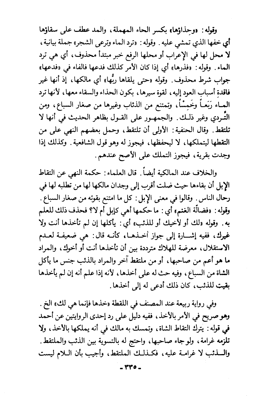 وقوله: "وحِذاؤها" بكسر الحاء المهملة، والمد عطف على سقاؤها أي خفها الذي تمشي عليه. وقوله: "ترد الماء وترعى الشجر" جملة بيانية، لا محل لها في الإعراب أو محلها الرفع خبر مبتدأ محذوف، أي هي ترد الماء. وقوله: "فذرها" أي إذا كان الأمر كذلك فدعها فالفاء في "فدعها" جواب شرط محذوف. وقوله "حتى يلقاها ربُّها" أي مالكها، إذ أنها غير فاقدةِ أسباب العود إليه، لقوة سيرها، يكون الحذاء والسقاء معها؛ لأنها ترد الماء رَبَعًا وخَمسًا، وتمتنع من الذئاب وغيرها من صغار السباع، ومن التَّردي وغير ذلك. والجمهور على القول بظاهر الحديث في أنها لا تلتقط. وقال الحنفية: الأولى أن تلتقط، وحمل بعضهم النهي على من التقطها ليتملكها, لا ليحفظها، فيجوز له وهو قول الشافعية. وكذلك إذا وجدت بقرية، فيجوز التملك على الأصح عندهم.