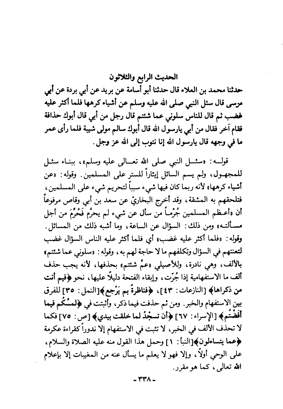 قوله: "سئل النبي صلى الله تعالى عليه وسلم "، ببناء سئل للمجهول، ولم بسم السائل إيثارًا للستر على المسلمين. وقوله: "عن أشياء كرهها" لأنه ربما كان فيها شيء سببًا لتحريم شيء على المسلمين، فتلحقهم به المشقة، وقد أخرج البخاريّ عن سعد بن أبي وقاص مرفوعًا أن "أعظم المسلمين جُرْمًا من سأل عن شيء لم يحرَّم فَحُرِّمَ من أجل مسألته" ومن ذلك: السؤال عن الساعة، وما أشبه ذلك من المسائل. وقوله: "فلما أكثر عليه غضب" أي فلما أكثر عليه الناس السؤال غضب لتعنتهم في السؤال وتكلفهم ما لا حاجة لهم به، وقوله: "سلوني عما شئتم" بالألف، وهي نادرة، وللأصيلي "عمَّ شئتم" بحذفها؛ لأنه يجب حذف ألف ما الاستفهامية إذا جُرُت، وإبقاء الفتحة دليلًا عليها، نحو {فِيمَ أَنْتَ مِنْ ذِكْرَاهَا} [النازعات: 43]، {فَنَاظِرَةٌ بِمَ يَرْجِعُ} [النمل: 35] للفرق بين الاستفهام والخبر. ومن ثم حذفت فيما ذكر، وأثبتت في} لَمَسَّكُمْ فِيمَا أَخَذْتُمْ عَذَابٌ عَظِيمٌ {[الأنفال: 68] {أَنْ تَسْجُدَ لِمَا خَلَقْتُ بِيَدَيَّ} [ص: 75] فكما لا تحذف الألف في الخبر، لا تثبت في الاستفهام إلا ندورًا كقراءة عكرمة {عَمَّ يَتَسَاءَلُونَ} [النبأ: 1]، وحمل هذا القول منه عليه الصلاة والسلام، على الوحي أولًا، وإلا فهو لا يعلم ما يسأل عنه من المغيبات إلا بإعلام الله تعالى، كما هو مقرر.