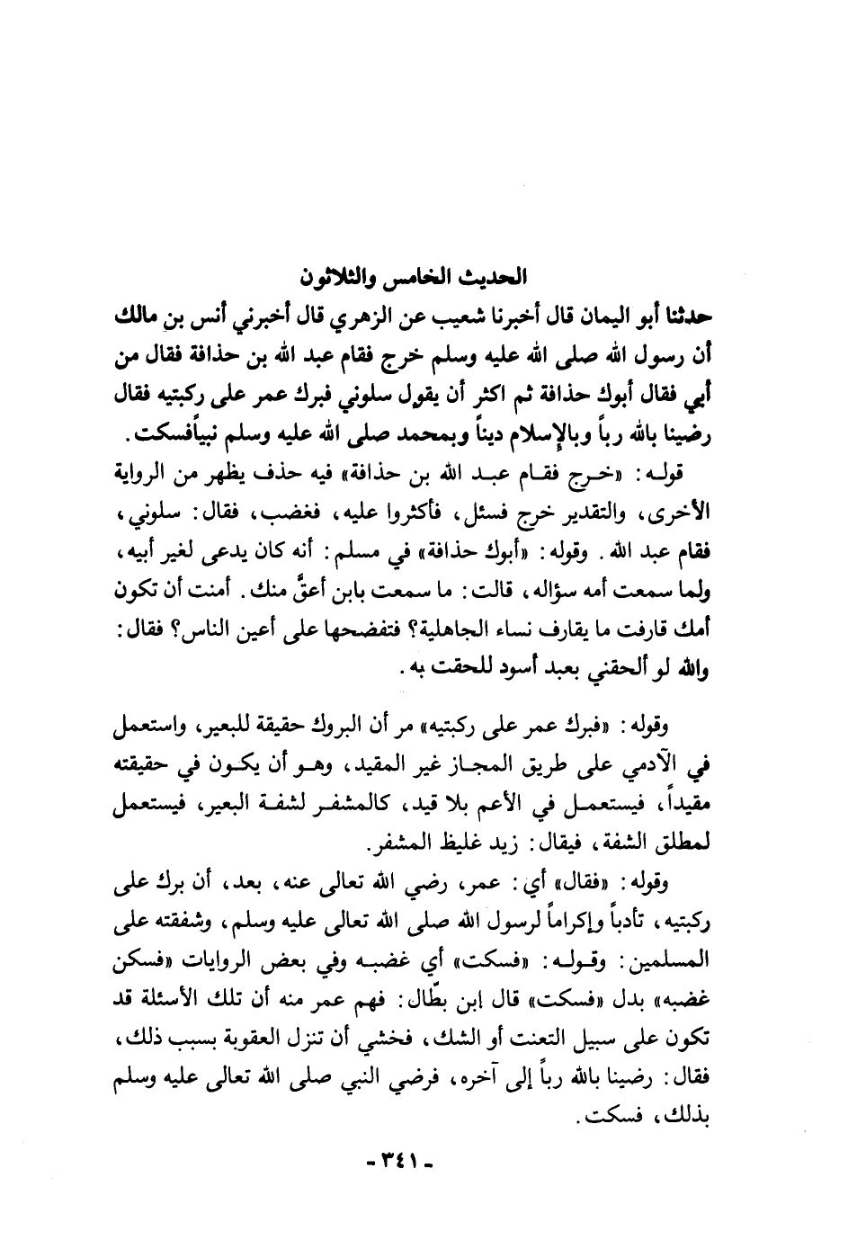 حَدَّثَنَا أَبُو الْيَمَانِ قَالَ أَخْبَرَنَا شُعَيْبٌ عَنِ الزُّهْرِيِّ قَالَ أَخْبَرَنِي أَنَسُ بْنُ مَالِكٍ أَنَّ رَسُولَ اللَّهِ -صلى الله عليه وسلم- خَرَجَ، فَقَامَ عَبْدُ اللَّهِ بْنُ حُذَافَةَ فَقَالَ مَنْ أَبِي فَقَالَ: "أَبُوكَ حُذَافَةُ". ثُمَّ أَكْثَرَ أَنْ يَقُولَ: "سَلُونِى". فَبَرَكَ عُمَرُ عَلَى رُكْبَتَيْهِ فَقَالَ رَضِينَا بِاللَّهِ رَبًّا، وَبِالإِسْلاَمِ دِينًا، وَبِمُحَمَّدٍ -صلى الله عليه وسلم- نَبِيًّا، فَسَكَتَ.