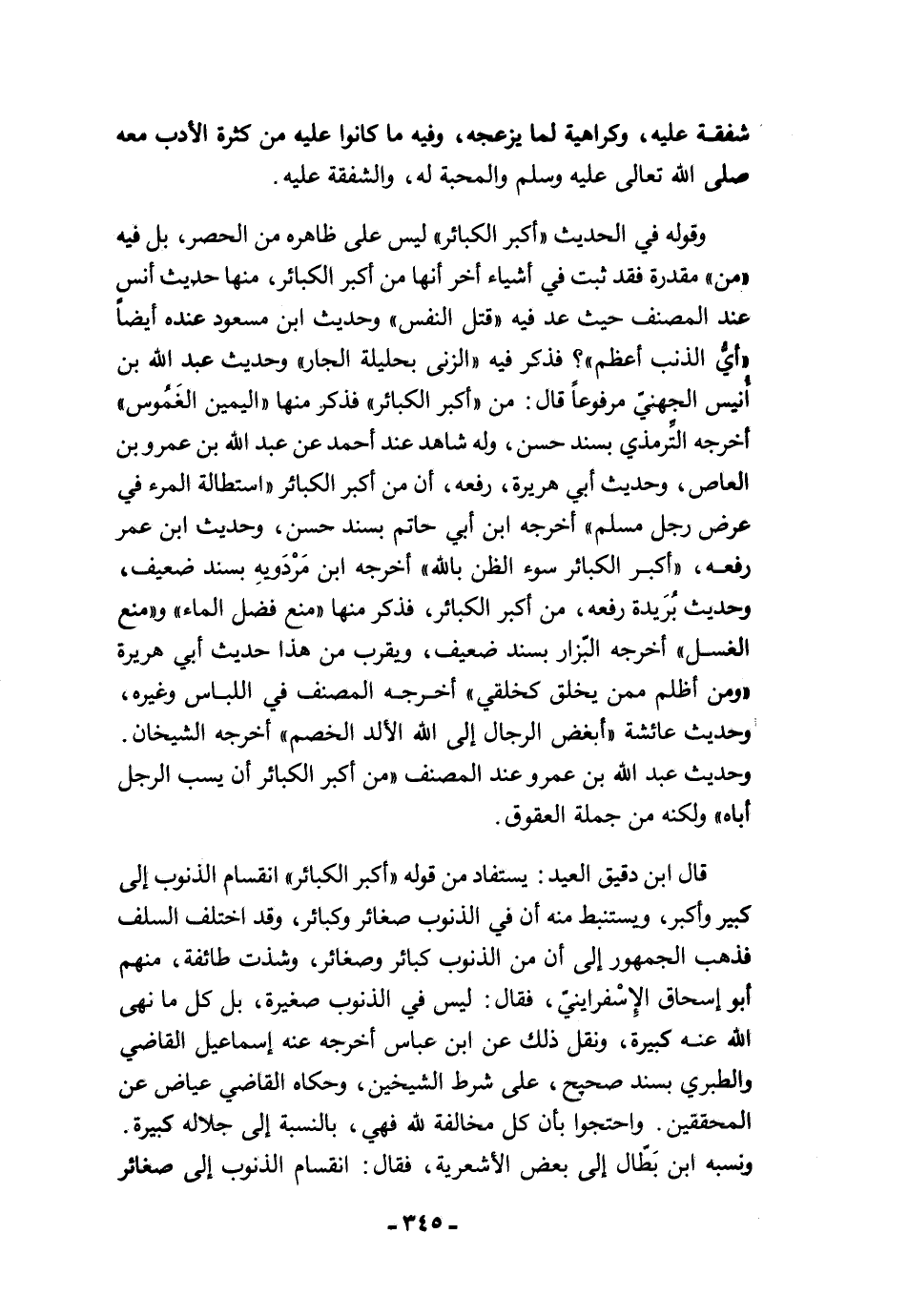 قال ابن دقيق العيد: يستفاد من قوله "أكبر الكبائر" انقسام الذنوب إلى كبير وأكبر، ويستنبط منه أن في الذنوب صغائر وكبائر، وقد اختلف السلف فذهب الجمهور إلى أن من الذنوب كبائر وصغائر، وشذت طائفة، منهم أبو إسحاق الإسْفراينيَّ، فقال: ليس في الذنوب صغيرة، بل كل ما نهى الله عنه كبيرة، ونقل ذلك عن ابن عباس أخرجه عنه إسماعيل القاضي والطبري بسند صحيح، على شرط الشيخين، وحكاه القاضي عياض عن المحققين. واحتجوا بأن كل مخالفة لله فهي، بالنسبة إلى جلاله كبيرة. ونسبه ابن بَطّال إلى بعض الأشعرية، فقال: انقسام الذنوب إلى صغائر