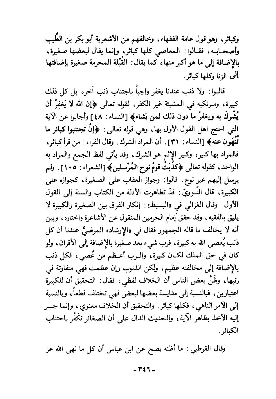 وكبائر، وهو قول عامة الفقهاء، وخالفهم من الأشعرية أبو بكر بن الطَّيب وأصحابه، فقالوا: المعاصي كلها كبائر، وإنما يقال لبعضها صغيرة، بالإضافة إلى ما هو أكبر منها، كما يقال: القُبْلة المحرمة صغيرة بإضافتها إلى الزنا وكلها كبائر.