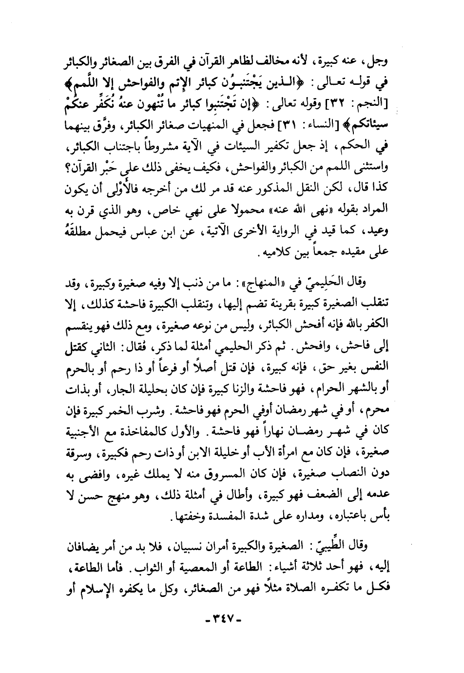 وقال الحَلِيميّ في "المنهاج": ما من ذنب إلا وفيه صغيرة وكبيرة، وقد تنقلب الصغيرة كبيرة بقرينة تضم إليها، وتنقلب الكبيرة فاحشة كذلك، إلا الكفر بالله فإنه أفحش الكبائر، وليس من نوعه صغيرة، ومع ذلك فهو ينقسم إلى فاحش، وافحش. ثم ذكر الحليمي أمثلة لما ذكر، فقال: الثاني كقتل النفس بغير حق، فإنه كبيرة، فإن قتل أصلًا أو فرعًا أو ذا رحم أو بالحرم أو بالشهر الحرام، فهو فاحشة والزنا كبيرة فإن كان بحليلة الجار، أو بذات محرم، أو في شهر رمضان أو في الحرم فهو فاحشة. وشرب الخمر كبيرة فإن كان في شهر رمضان نهارًا فهو فاحشة. والأول كالمفاخذة مع الأجنبية صغيرة، فإن كان مع امرأة الأب أو خليلة الابن أو ذات رحم فكبيرة، وسرقة دون النصاب صغيرة، فإن كان المسروق منه لا يملك غيره، وافضى به عدمه إلى الضعف فهو كبيرة، وأطال في أمثلة ذلك، وهو منهج حسن لا بأس باعتباره، ومداره على شدة المفسدة وخفتها.