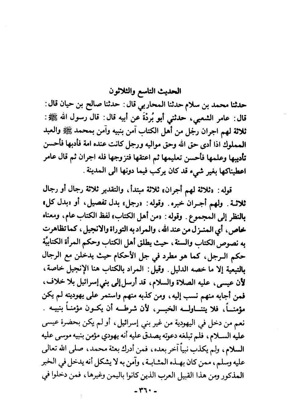 أَخْبَرَنَا مُحَمَّدٌ ابْنُ سَلاَمٍ حَدَّثَنَا الْمُحَارِبِيُّ قَالَ: حَدَّثَنَا صَالِحُ بْنُ حَيَّانَ قَالَ: قَالَ: عَامِرٌ الشَّعْبِيُّ، حَدَّثَنِي أَبُو بُرْدَةَ عَنْ أَبِيهِ قَالَ قَالَ رَسُولُ اللَّهِ -صلى الله عليه وسلم-: "ثَلاَثَةٌ لَهُمْ أَجْرَانِ رَجُلٌ مِنْ أَهْلِ الْكِتَابِ آمَنَ بِنَبِيِّهِ، وَآمَنَ بِمُحَمَّدٍ -صلى الله عليه وسلم- وَالْعَبْدُ الْمَمْلُوكُ إِذَا أَدَّى حَقَّ اللَّهِ وَحَقَّ مَوَالِيهِ، وَرَجُلٌ كَانَتْ عِنْدَهُ أَمَةٌ فَأَدَّبَهَا، فَأَحْسَنَ تَأْدِيبَهَا، وَعَلَّمَهَا فَأَحْسَنَ تَعْلِيمَهَا، ثُمَّ أَعْتَقَهَا فَتَزَوَّجَهَا، فَلَهُ أَجْرَانِ". ثُمَّ قَالَ عَامِرٌ أَعْطَيْنَاكَهَا بِغَيْرِ شَيْءٍ، قَدْ كَانَ يُرْكَبُ فِيمَا دُونَهَا إِلَى الْمَدِينَةِ.