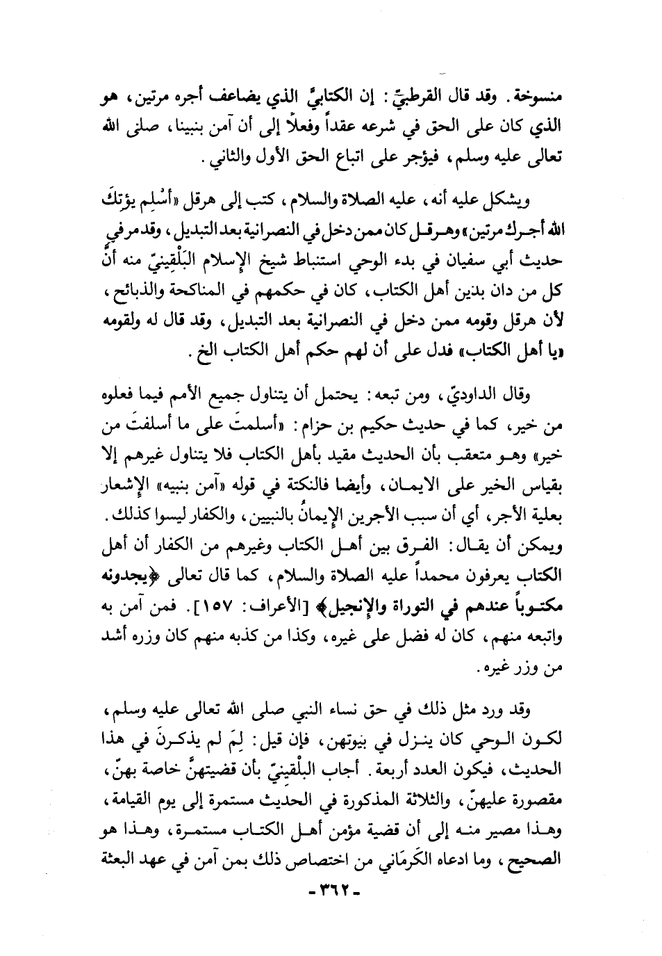 ويشكل عليه أنه، عليه الصلاة والسلام، كتب إلى هرقل "أسْلِم يؤتكَ الله أجرك مرتين" وهرقل كان ممن دخل في النصرانية بعد التبديل، وقد مر في حديث أبي سفيان في بدء الوحي استنباط شيخ الإِسلام البَلْقِينيّ منه أنَّ كل من دان بدين أهل الكتاب، كان في حكمهم في المناكحة والذبائح، لأن هرقل وقومه ممن دخل في النصرانية بعد التبديل، وقد قال له ولقومه "يا أهل الكتاب" فدل على أن لهم حكم أهل الكتاب الخ.