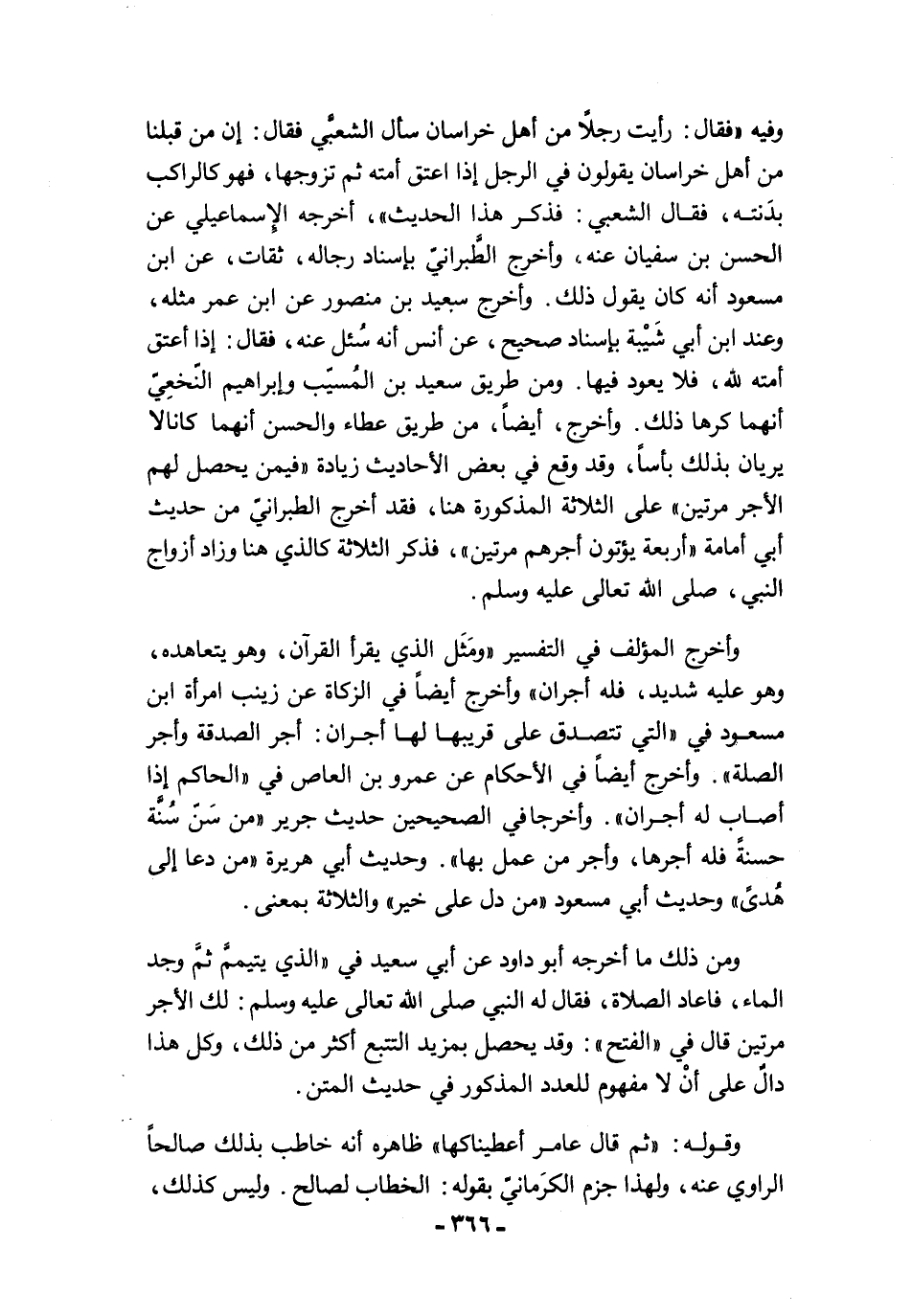 وفيه "فقال: رأيت رجلًا من أهل خراسان سأل الشعبي فقال: إن من قبلنا من أهل خراسان يقولون في الرجل إذا اعتق أمته ثم تزوجها، فهو كالراكب بدَنته، فقال الشعبي: فذكر هذا الحديث"، أخرجه الإِسماعيلي عن الحسن بن سفيان عنه, وأخرج الطَّبرانيّ بإسناد رجاله، ثقات، عن ابن مسعود أنه كان يقول ذلك. وأخرج سعيد بن منصور عن ابن عمر مثله، وعند ابن أبي شَيْبة بإسناد صحيح، عن أنس أنه سُئل عنه، فقال: إذا أعتق أمته لله، فلا يعود فيها. ومن طريق سعيد بن المُسيّب وإبراهيم النّخعِيّ أنهما كرها ذلك. وأخرج، أيضًا، من طريق عطاء والحسن أنهما كانا لا يريان بذلك بأسًا، وقد وقع في بعض الأحاديث زيادة "فيمن يحصل لهم الأجر مرتين" على الثلاثة المذكورة هنا، فقد أخرج الطبرانيّ من حديث أبي أمامة "أربعة يؤتون أجرهم مرتين"، فذكر الثلاثة كالذي هنا وزاد أزواج النبي، صلى الله تعالى عليه وسلم.