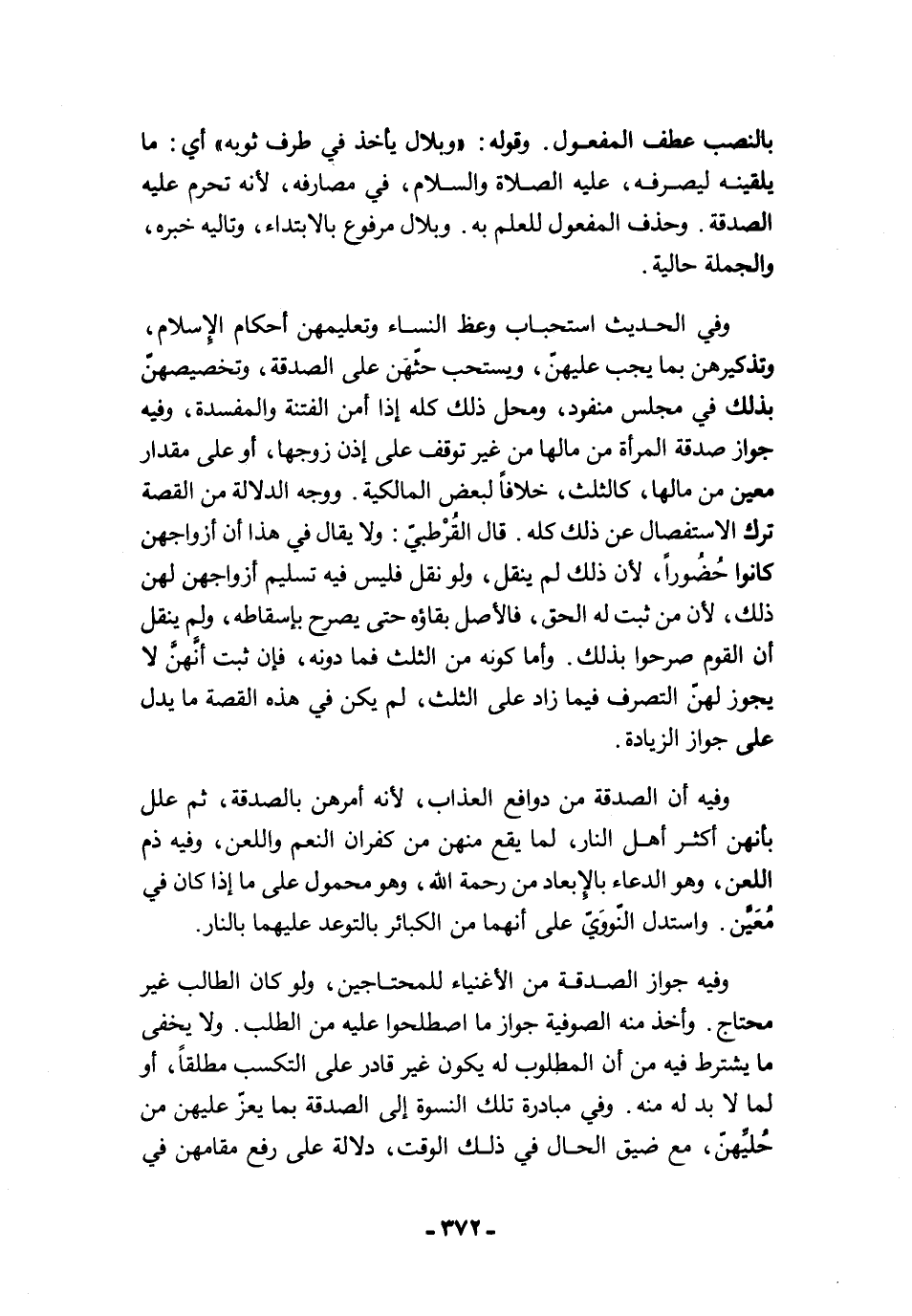 وفيه جواز الصدقة من الأغنياء للمحتاجين، ولو كان الطالب غير محتاج. وأخذ منه الصوفية جواز ما اصطلحوا عليه من الطلب. ولا يخفى ما يشترط فيه من أن المطلوب له يكون غير قادر على التكسب مطلقًا، أو لما لابد له منه. وفي مبادرة تلك النسوة إلى الصدقة بما يعزّ عليهن من حُليَّهنّ، مع ضيق الحال في ذلك الوقت، دلالة على رفع مقامهن في