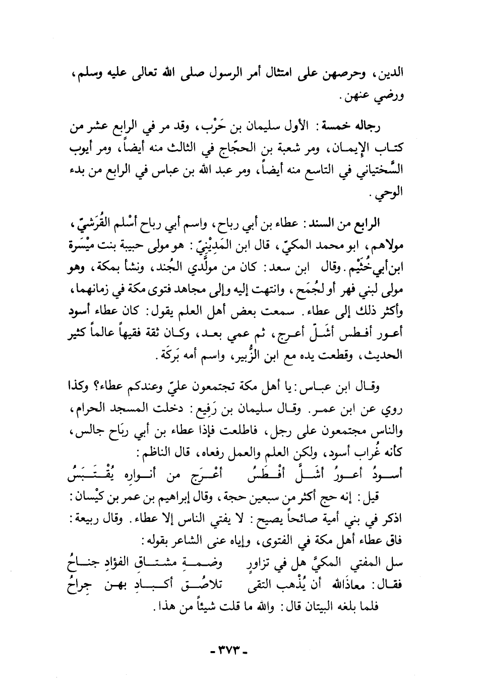 الرابع من السند: عطاء بن أبي رباح، واسم أبي رباح أسْلم القُرَشيّ، مولاهم، أبو محمد المكيّ، قال ابن المَدِيْنِيّ: هو مولى حبيبة بنت ميْسَرة ابن أبي خُثَيْم. وقال ابن سعد: كان من مولَّدي الجُند، ونشأ بمكة، وهو مولى لبني فهر أو لجُمَح، وانتهت إليه وإلى مجاهد فتوى مكة في زمانهما، وأكثر ذلك إلى عطاء. سمعت بعض أهل العلم يقول: كان عطاء أسود أعور أفطس أشَلّ أعرج، ثم عمي بعد، وكان ثقة فقيهًا عالمًا كثير الحديث، وقطعت يده مع ابن الزُّبير، واسم أمه بَركَة.
