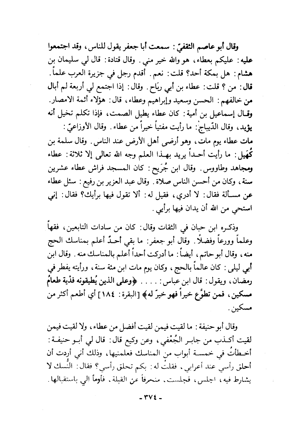 وقال أبو حنيفة: ما لقيت فيمن لقيت أفضل من عطاء، ولا لقيت فيمن لقيت أكذب من جابر الجُعْفي، وعن وكيع قال: قال لي أبو حنيفة: أخطأتُ في خمسة أبواب في المناسك فعلمنيها، وذلك أني أردت أن أحلق رأسي عند أعرابي, فقلت له: بكم تحلق رأسي؟ فقال: النُّسك لا يشارط فيه، اجلس، فجلست، منحرفًا عن القبلة، فأومأ إلي باستقبالها.