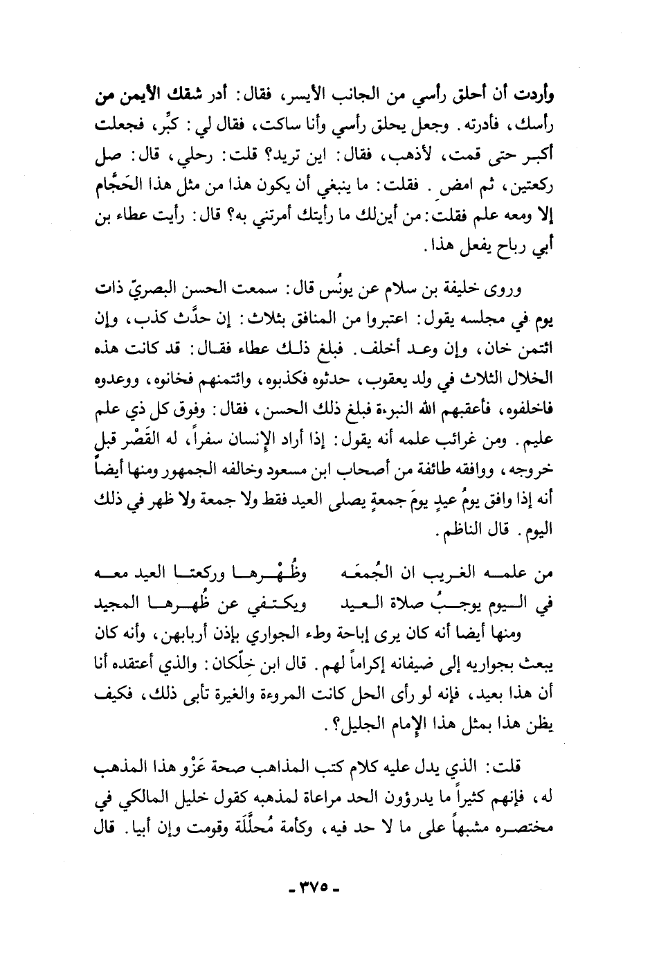 وأردت أن أحلق رأسي من الجانب الأيسر، فقال: أدر شقك الأيمن من رأسك، فأدرته. وجعل يحلق رأسي وأنا ساكت، فقال لي: كبَّر، فجعلت أكبر حتى قمت، لأذهب، فقال: اين تريد؟ قلت: رحلي، قال: صل ركعتين، ثم امضِ. فقلت: ما ينبغي أن يكون هذا من مثل هذا الحَجَّام إلا ومعه علم فقلتَ: من أين لك ما رأيتك أمرتني به؟ قال: رأيت عطاء بن أبي رباح يفعل هذا.