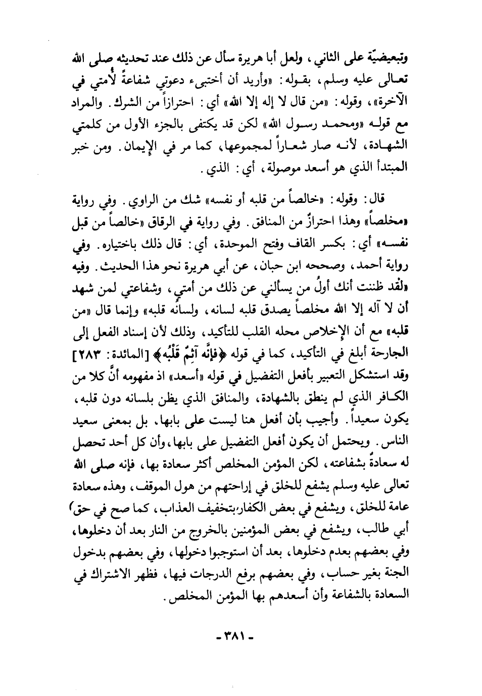 قال: وقوله: "خالصًا من قلبه أو نفسه" شك من الراوي. وفي رواية "مخلصًا" وهذا احترازٌ من المنافق. وفي رواية في الرقاق "خالصًا من قبل نفسه" أي: بكسر القاف وفتح الموحدة، أي: قال ذلك باختياره. وفي رواية أحمد، وصححه ابن حبان، عن أبي هريرة نحو هذا الحديث. وفيه "لقْد ظننت أنك أولُ من يسألني عن ذلك من أمتي، وشفاعتي لمن شهد أن لا اله إلا الله مخلصًا يصدق قلبه لسانه، ولسانه قلبه" وإنما قال "من قلبه" مع أن الإخلاص محله القلب للتأكيد، وذلك لأن إسناد الفعل إلى الجارحة أبلغ في التأكيد، كما في قوله {فَإِنَّهُ آثِمٌ قَلْبُهُ} [البقرة: 283] وقد استشكل التعبير بأفعل التفضيل في قوله "أسعد" إذ مفهومه أنَّ كلا من الكافر الذي لم ينطق بالشهادة، والمنافق الذي يظن بلسانه دون قلبه، يكون سعيدًا. وأجيب بان أفعل هنا ليست على بابها, بل بمعنى سعيد الناس. ويحتمل أن يكون أفعل التفضيل على بابها، وأن كل أحد تحصل له سعادةٌ بشفاعته، لكن المؤمن المخلص أكثر سعادة بها، فإنه صلى الله تعالى عليه وسلم يشفع للخلق في إراحتهم من هول الموقف، وهذه سعادة عامة للخلق، ويشفع في بعض الكفار بتخفيف العذاب، كما صح في حق أبي طالب، ويشفع في بعض المؤمنين بالخروج من النار بعد أن دخلوها، وفي بعضهم بعدم دخلوها، بعد أن استوجبوا دخولها، وفي بعضهم بدخول الجنة بغير حساب، وفي بعضهم برفع الدرجات فيها، فظهر الاشتراك في السعادة بالشفاعة وأن أسعدهم بها المؤمن المخلص.