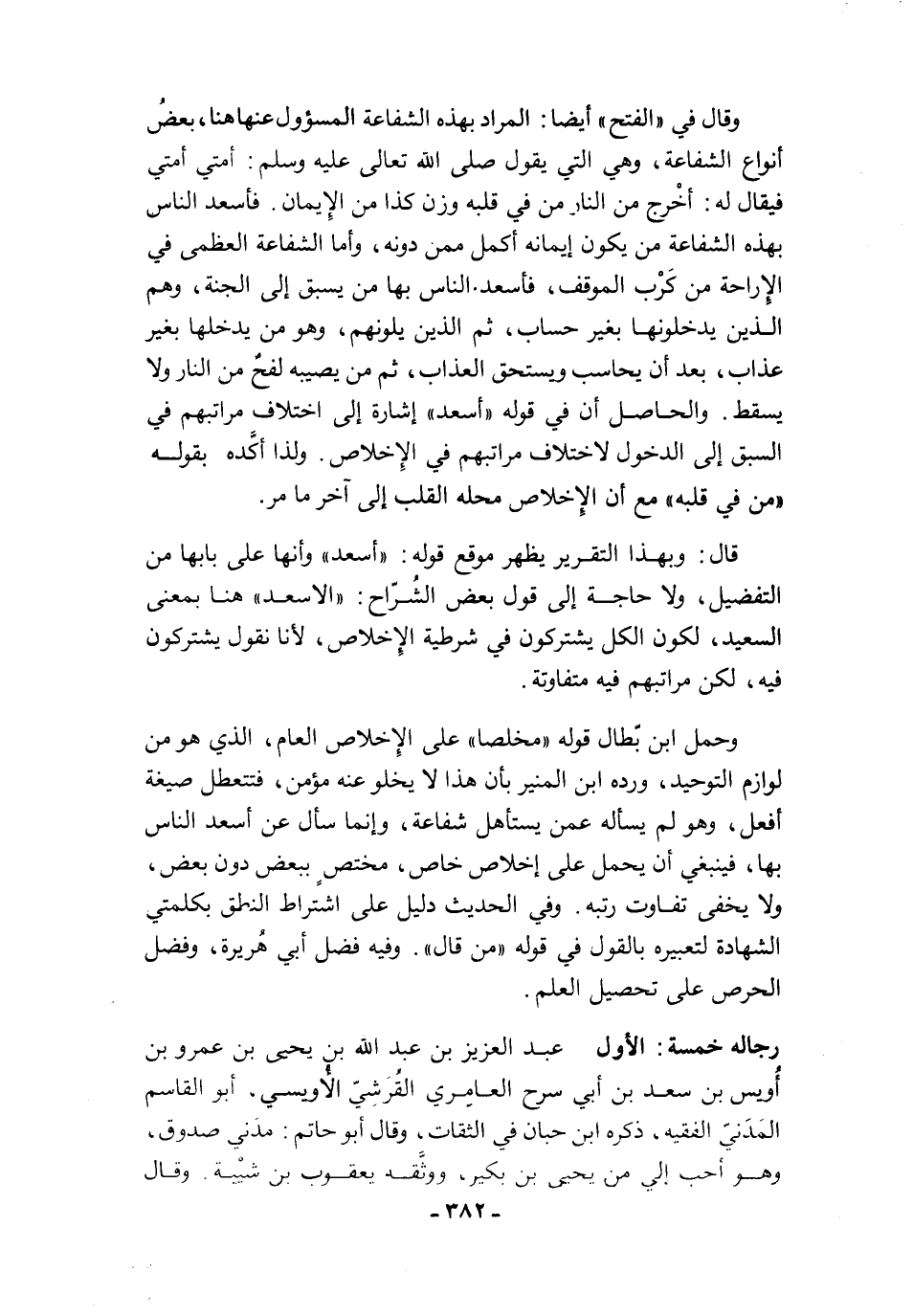 وقال في "الفتح" أيضًا: المراد بهذه الشفاعة المسؤول عنها هنا، بعضُ أنواع الشفاعة، وهي التي يقول صلى الله تعالى عليه وسلم: أمتي أمتي فيقال له: أخْرج من النار من في قلبه وزن كذا من الإيمان. فأسعد الناس بهذه الشفاعة من يكون إيمانه أكمل ممن دونه، وأما الشفاعة العظمى في الِإراحة من كَرْب الموقف، فأسعد الناس بها من يسبق إلى الجنة، وهم الذين يدخلونها بغير حساب، ثم الذين يلونهم، وهو من يدخلها بغير عذاب، بعد أن يحاسب ويستحق العذاب، ثم من يصيبه لفحٌ من النار ولا يسقط. والحاصل أن في قوله "أسعد" إشارة إلى اختلاف مراتبهم في السبق إلى الدخول لاختلاف مراتبهم في الإخلاص. ولذا أكَّده بقوله "من في قلبه" مع أن الإِخلاص محله القلب إلى آخر ما مر.