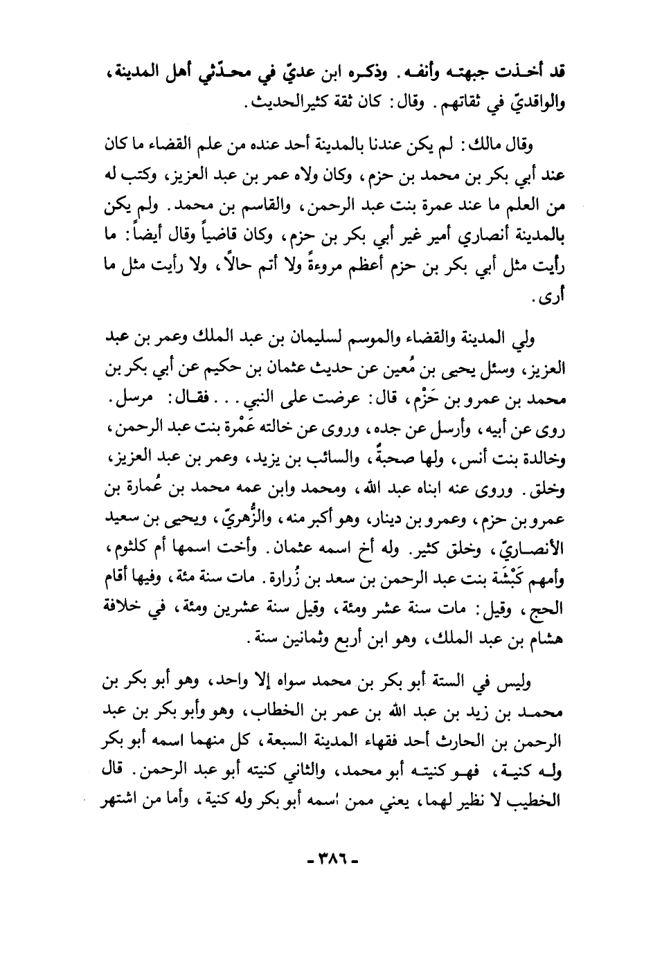 وليس في الستة أبو بكر بن محمد سواه إلا واحد، وهو أبو بكر بن محمد بن زيد بن عبد الله بن عمر بن الخطاب، وهو وأبو بكر بن عبد الرحمن بن الحارث أحد فقهاء المدينة السبعة، كل منهما اسمه أبو بكر وله كنية، فهو كنيته أبو محمد، والثاني كنيته أبو عبد الرحمن. قال الخطيب لا نظير لهما، يعني ممن اسمه أبو بكر وله كنية، وأما من اشتهر