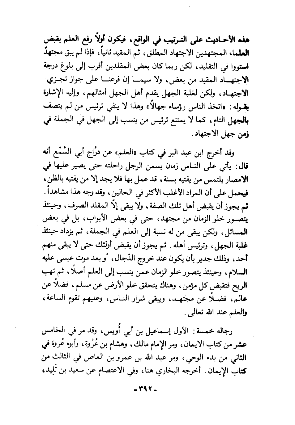 وقد أخرج ابن عبد البر في كتاب "العلم" عن درَّاج أبي السَّمْع أنه قال: يأتي على الناس زمان يسمن الرجل راحلته حتى يصير عليها في الامصار يلتمس من يفتيه بسنة، قد عمل بها فلا يجد إلا من يفتيه بالظن، فيحمل على أن المراد الأغلب الأكثر في الحالين، وقد وجه هذا مشاهدًا. ثم يجوز أن يقبض أهل تلك الصفة، ولا يبقى إلاَّ المقلد الصرف، وحينئذ يتصور خلو الزمان من مجتهد، حتى في بعض الأبواب، بل في بعض المسائل، ولكن يبقى من له نسبة إلى العلم في الجملة، ثم يزداد حينئذ غلبة الجهل، وترئيس أهله. ثم يجوز أن يقبض أولئك حتى لا يبقى منهم أحد، وذلك جدير بأن يكون عند خروج الدّجال، أو بعد موت عيسى عليه السلام، وحينئذ يتصور خلو الزمان عمن ينسب إلى العلم أصلًا، ثم تهب الريح فتقبض كل مؤمن، وهناك يتحقق خلو الأرض عن مسلم، فضلًا عن عالم، فضلًا عن مجتهد، ويبقى شرار الناس، وعليهم تقوم الساعة، والعلم عند الله تعالى.
