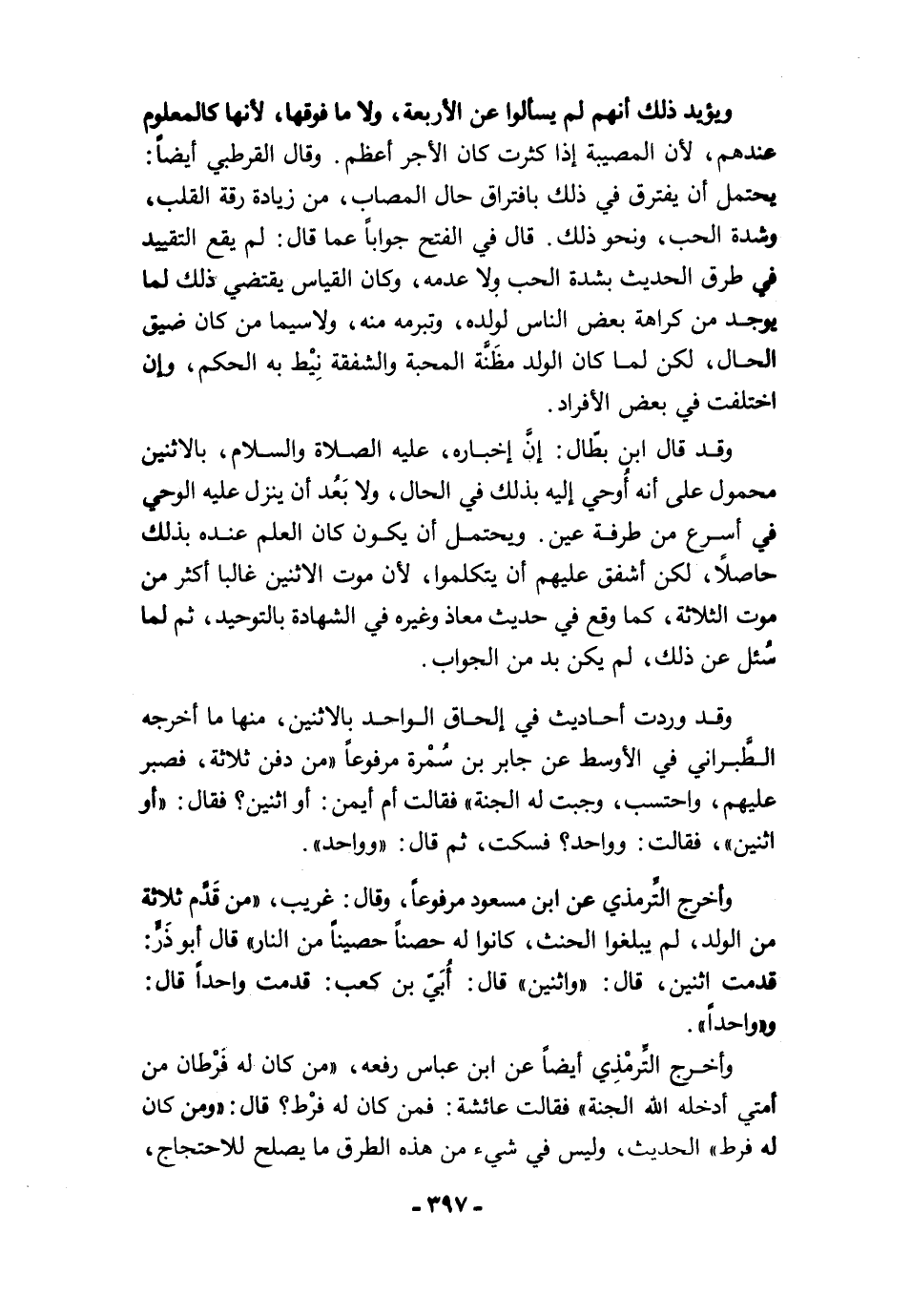 ويؤيد ذلك أنهم لم يسألوا عن الأربعة، ولا ما فوقها, لأنها كالمعلوم عندهم, لأن المصيبة إذا كثرت كان الأجر أعظم. وقال القرطبي أيضًا: يحتمل أن يفترق في ذلك بافتراق حال المصاب، من زيادة رقة القلب، وشدة الحب، ونحو ذلك. قال في الفتح جوابًا عما قال: لم يقع التقييد في طرق الحديث بشدة الحب ولا عدمه، وكان القياس يقتضي ذلك لما يوجد من كراهة بعض الناس لولده، وتبرمه منه، ولاسيما من كان ضيق الحال، لكن لما كان الولد مظَنَّة المحبة والشفقة نِيْط به الحكم، وإن اختلفت في بعض الأفراد.