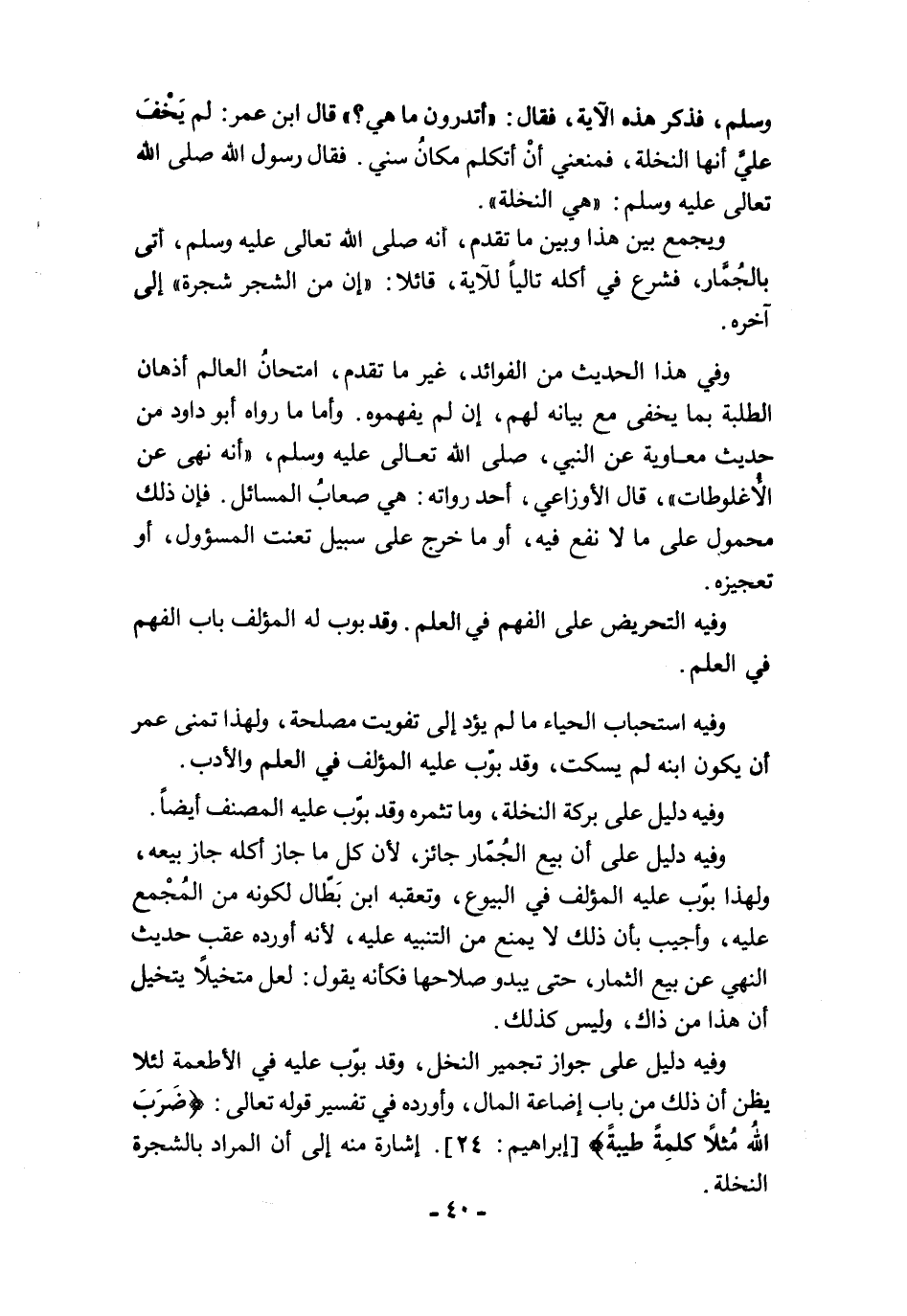 وفي هذا الحديث من الفوائد، غير ما تقدم، امتحانُ العالم أذهان الطلبة بما يخفى مع بيانه لهم، إن لم يفهموه. وأما ما رواه أبو داود من حديث معاوية عن النبي، صلى الله تعالى عليه وسلم، "أنه نهى عن الأُغلوطات"، قال الأوزاعي، أحد رواته: هي صعابُ المسائل. فإن ذلك محمول على ما لا نفع فيه، أو ما خرج على سبيل تعنت المسؤول، أو تعجيزه.