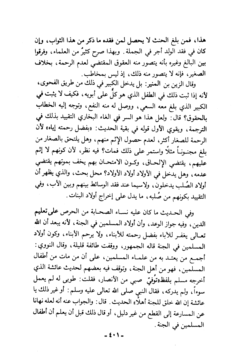 وفي الحديث ما كان عليه نساء الصحابة من الحرص على تعليم الدين، وفيه جواز الوعد، وأن أولاد المسلمين في الجنة, لأنه يبعد أن الله تعالى يغفر للآباء بفضل رحمته للأبناء، ولا يرحم الأبناء، وكون أولاد المسلمين في الجنة قاله الجمهور، ووقفت طائفة قليلة، وقال النووي: أجمع من يعتد به من علماء المسلمين، على أن من مات من أطفال المسلمين، فهو من أهل الجنة، وتوقف فيه بعضهم لحديث عائشة الذي أخرجه مسلم بلفظ "تُوفيّ صبي من الأنصار، فقلت: طوبى له لم يعمل سوءًا، ولم يدركه، فقال النبي صلى الله تعالى عليه وسلم: أو غير ذلك يا عائشة إن الله خلق للجنة أهلًا" الحديث. قال: والجواب عنه أنه لعله نهانا عن المسارعة إلى القطع من غير دليل، أو قال ذلك قبل أن يعلم أن أطفال المسلمين في الجنة.