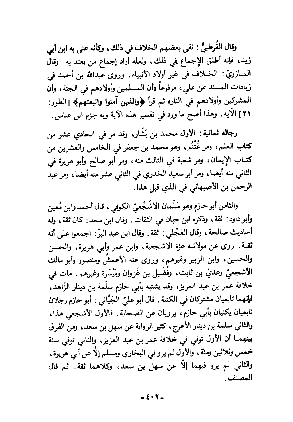 وقال القُرطبيُّ: نفى بعضهم الخلاف في ذلك، وكأنه عني به ابن أبي زيد، فإنه أطلق الإجماع في ذلك، ولعله أراد إجماع من يعتد به. وقال المازريّ: الخلاف في غير أولاد الأنبياء. وروى عبد الله بن أحمد في زيادات المسند عن علي، مرفوعًا "أن المسلمين وأولادهم في الجنة، وأن المشركين وأولادهم في النار" ثم قرأ {وَالَّذِينَ آمَنُوا وَاتَّبَعَتْهُمْ} [الطور: 21] الآية. وهذا أصح ما ورد في تفسير هذه الآية وبه جزم ابن عباس.