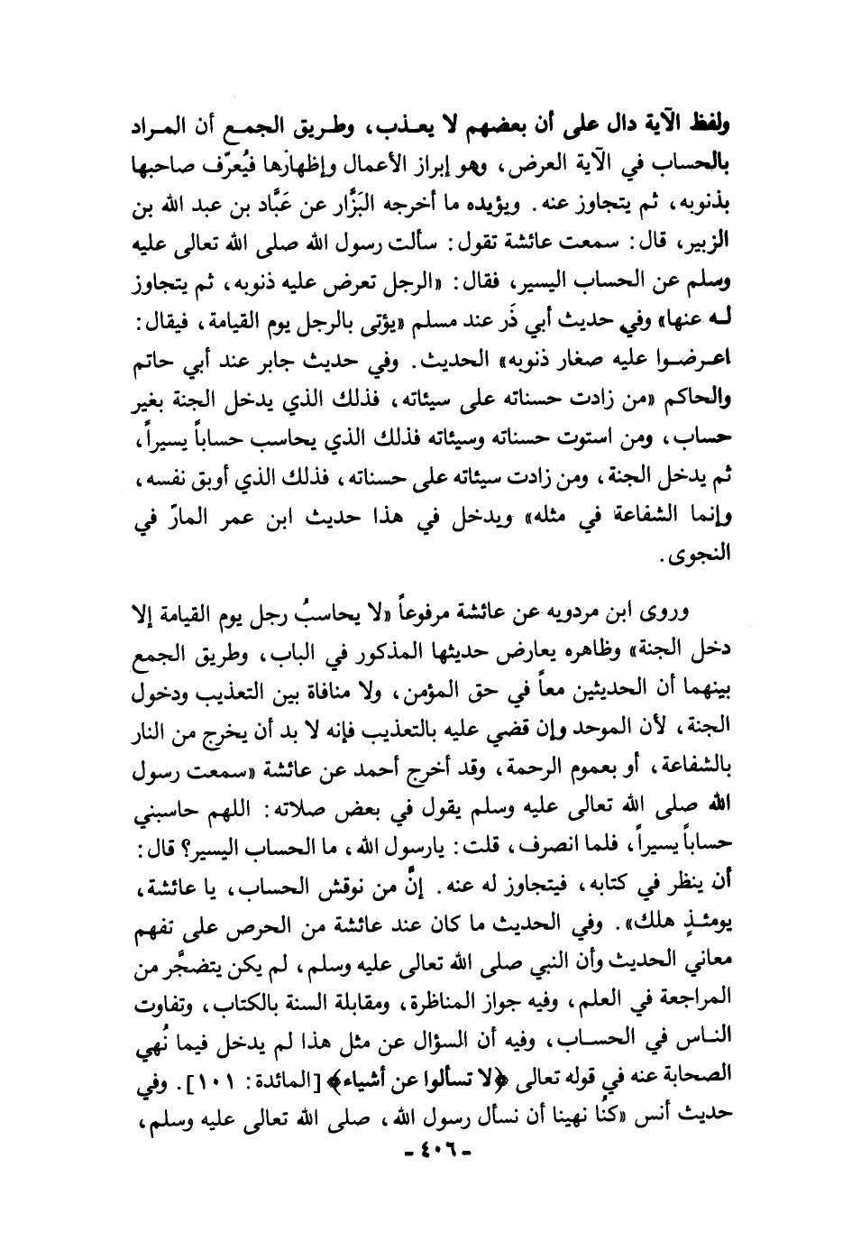 ولفظ الآية دال على أن بعضهم لا يعذب، وطريق الجمع أن المراد بالحساب في الآية العرض، وهو إبراز الأعمال وإظهارها فيُعرَّف صاحبها بذنوبه، ثم يتجاوز عنه. ويؤيده ما أخرجه البَزَّار عن عَبَّاد بن عبد الله بن الزبير، قال: سمعت عائشة تقول: سألت رسول الله صلى الله تعالى عليه وسلم عن الحساب اليسير، فقال: "الرجل تعرض عليه ذنوبه، ثم يتجاوز له عنها" وفي حديث أبي ذَر عند مسلم "يؤتى بالرجل يوم القيامة، فيقال: اعرضوا عليه صغار ذنوبه" الحديث. وفي حديث جابر عند أبي حاتم والحاكم "من زادت حسناته على سيئاته، فذلك الذي يدخل الجنة بغير حساب، ومن استوت حسناته وسيئاته فذلك الذي يحاسب حسابًا يسيرًا، ثم يدخل الجنة، ومن زادت سيئاته على حسناته، فذلك الذي أوبق نفسه، وإنما الشفاعة في مثله" ويدخل في هذا حديث ابن عمر المارّ في النجوى.