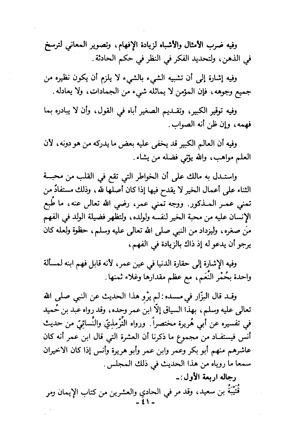 واستدل به مالك على أن الخواطر التي تقع في القلب من محبة الثناء على أعمال الخير لا يقدح فيها إذا كان أصلها لله، وذلك مستفادٌ من تمني عمر المذكور. ووجه تمني عمر، رضي الله تعالى عنه، ما طُبع الإنسان عليه من محبة الخير لنفسه ولولده، ولتظهر فضيلة الولد في الفهم من صغره، وليزداد من النبي صلى الله تعالى عليه وسلم، حظوة ولعله كان يرجو أن يدعو له إذ ذاك بالزيادة في الفهم.