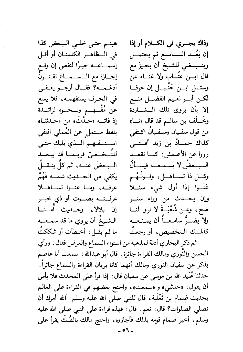 ثم ذكر البخاري أدلة لمذهبه من استواء السماع والعرض فقال: ورأي الحسن والثَّوري ومالك القراءة جائزة. قال أبو عبد الله: سمعت أبا عاصم يذكر عن سفيان الثوري ومالك أنهما كانا يريان القراءة والسماع جائزًا. حدثنا عُبَيد الله بن موسى عن سفيان قال: إذا قرأ على المحدث فلا بأس أن يقول: "حدثني" و"سمعت"، واحتج بعضهم في القراءة على العالم بحديث ضِمامَ بن ثَعْلَبة، قال للنبي صلى الله عليه وسلم: آلله أمرك أن تصلي الصلوات؟ قال: نعم. قال: فهذه قراءة على النبي صلى الله عليه وسلم، أخبر ضمام قومه بذلك فأجازوه، واحتج مالك بالصَّكّ يقرأ على