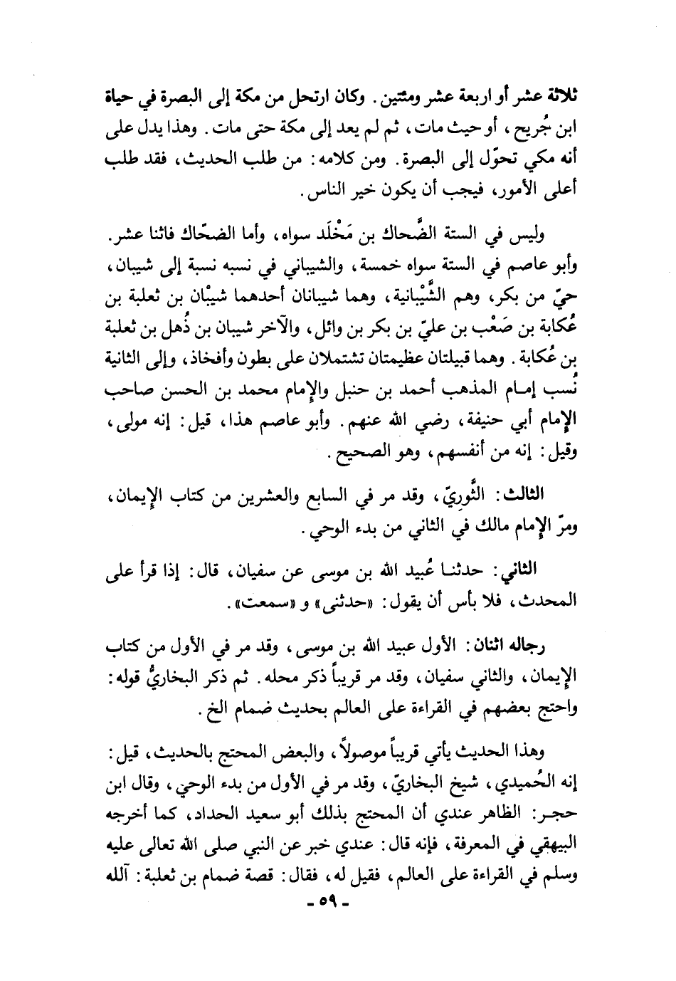 وهذا الحديث يأتي قريبًا موصولًا، والبعض المحتج بالحديث، قيل: إنه الحُميدي، شيخ البخاريّ، وقد مر في الأول من بدء الوحي، وقال ابن حجر: الظاهر عندي أن المحتج بذلك أبو سعيد الحداد، كما أخرجه البيهقي في المعرفة، فإنه قال: عندي خبر عن النبي صلى الله تعالى عليه وسلم في القراءة على العالم، فقيل له، فقال: قصة ضمام بن ثعلبة: آلله
