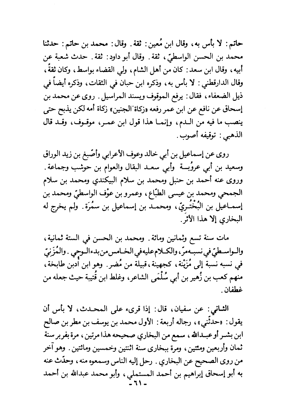 حاتم: لا بأس به، وقال ابن مُعين: ثقة. وقال: محمد بن حاتم: حدثنا محمد بن الحسن الواسطىّ، ثقة. وقال أبو داود: ثقة. حدث شعبة عن أبيه، وقال ابن سعد: كان من أهل الشام، ولي القضاء بواسط، وكان ثقةً، وقال الدارقطني: لا بأس به، وذكره ابن حبان في الثقات، وذكره أيضًا في ذيل الضعفاء، فقال: يرفع الموقوف ويسند المراسيل. روى عن محمد بن إسحاق عن نافع عن ابن عمر رفعه "زكاة الجنين" زكاة أمه لكن يذبح حتى ينصب ما فيه من الدم، وإنما هذا قول ابن عمر، موقوف، وقد قال الذهبي: توقيفه أصوب.