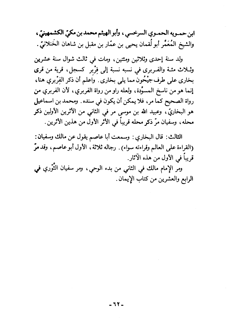 ولد سنة إحدى وثلاثين ومئتين، ومات في ثالث شوال سنة عشرين وثلاث مئة والفربرى في نسبه نسبة إلى فِرْبِر كسجل، قرية من قرى بخارى على طرف جيْحُون مما يلي بخارى. واعلم أن ذكر الفِرْبري هنا، إنما هو من ناسخ المسوَّدة، ولعله راو من رواة الفربري، لأن الفربري من رواة الصحيح كما مر، فلا يمكن أن يكون في سنده. ومحمد بن إسماعيل هو البخاريّ، وعبيد الله بن موسى مر في الثاني من الأثرين الأولين ذكر محله، وسفيان مرّ ذكر محله قريبًا في الأثر الأول من هذين الأثرين.