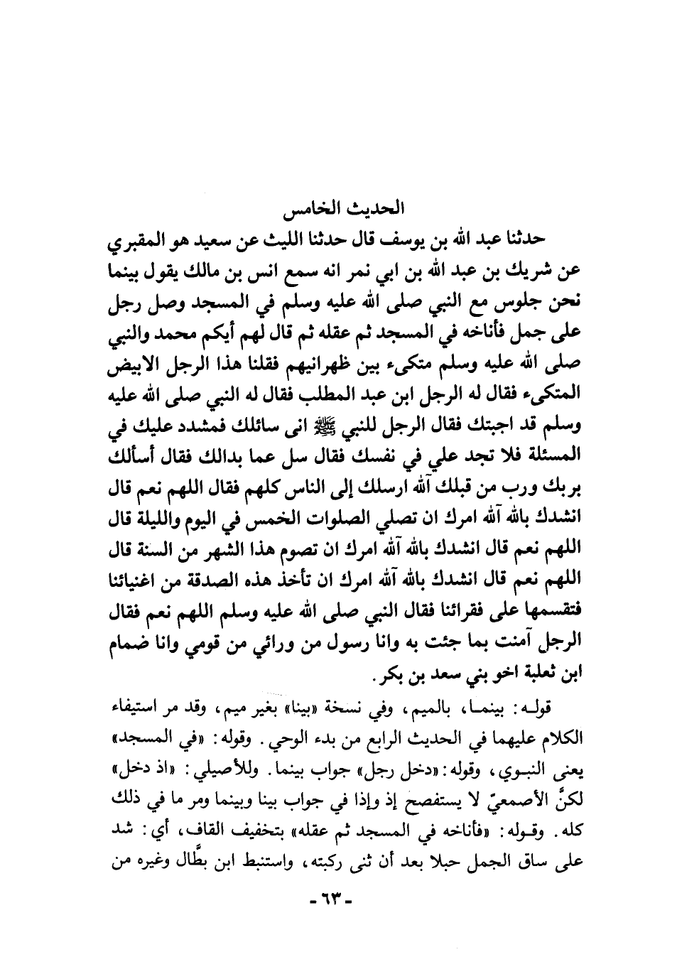 حَدَّثَنَا عَبْدُ اللَّهِ بْنُ يُوسُفَ قَالَ حَدَّثَنَا اللَّيْثُ عَنْ سَعِيدٍ هُوَ الْمَقْبُرِيُّ عَنْ شَرِيكِ بْنِ عَبْدِ اللَّهِ بْنِ أَبِى نَمِرٍ أَنَّهُ سَمِعَ أَنَسَ بْنَ مَالِكٍ يَقُولُ بَيْنَمَا نَحْنُ جُلُوسٌ مَعَ النَّبِيِّ -صلى الله عليه وسلم- فِى الْمَسْجِدِ، وَصَلَ رَجُلٌ عَلَى جَمَلٍ فَأَنَاخَهُ فِى الْمَسْجِدِ، ثُمَّ عَقَلَهُ، ثُمَّ قَالَ لَهُمْ أَيُّكُمْ مُحَمَّدٌ وَالنَّبِيُّ -صلى الله عليه وسلم- مُتَّكِىءٌ بَيْنَ ظَهْرَانَيْهِمْ. فَقُلْنَا هَذَا الرَّجُلُ الأَبْيَضُ الْمُتَّكِىءُ. فَقَالَ لَهُ الرَّجُلُ ابْنَ عَبْدِ الْمُطَّلِبِ فَقَالَ لَهُ النَّبِيُّ -صلى الله عليه وسلم-: "قَدْ أَجَبْتُكَ". فَقَالَ الرَّجُلُ لِلنَّبِيِّ -صلى الله عليه وسلم- إِنِّى سَائِلُكَ فَمُشَدِّدٌ عَلَيْكَ فِى الْمَسْأَلَةِ فَلاَ تَجِدْ عَلَىَّ فِى نَفْسِكَ. فَقَالَ: "سَلْ عَمَّا بَدَا لَكَ". فَقَالَ أَسْأَلُكَ بِرَبِّكَ وَرَبِّ مَنْ قَبْلَكَ، آللَّهُ أَرْسَلَكَ إِلَى النَّاسِ كُلِّهِمْ فَقَالَ: "اللَّهُمَّ نَعَمْ". قَالَ أَنْشُدُكَ بِاللَّهِ، آللَّهُ أَمَرَكَ أَنْ نُصَلِّىَ الصَّلَوَاتِ الْخَمْسَ فِى الْيَوْمِ وَاللَّيْلَةِ قَالَ: "اللَّهُمَّ نَعَمْ". قَالَ أَنْشُدُكَ بِاللَّهِ، آللَّهُ أَمَرَكَ أَنْ نَصُومَ هَذَا الشَّهْرَ مِنَ السَّنَةِ قَالَ: "اللَّهُمَّ نَعَمْ". قَالَ أَنْشُدُكَ بِاللَّهِ، آللَّهُ أَمَرَكَ أَنْ تَأْخُذَ هَذِهِ الصَّدَقَةَ مِنْ أَغْنِيَائِنَا فَتَقْسِمَهَا عَلَى فُقَرَائِنَا فَقَالَ النَّبِيُّ -صلى الله عليه وسلم-: "اللَّهُمَّ نَعَمْ". فَقَالَ الرَّجُلُ آمَنْتُ بِمَا جِئْتَ بِهِ، وَأَنَا رَسُولُ مَنْ وَرَائِى مِنْ قَوْمِي، وَأَنَا ضِمَامُ بْنُ ثَعْلَبَةَ أَخُو بَنِى سَعْدِ بْنِ بَكْرٍ.
