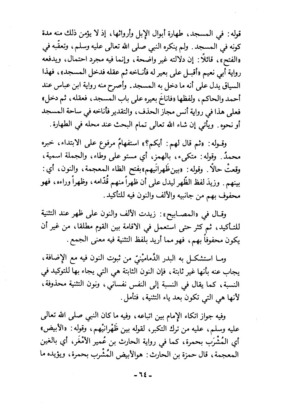 قوله: في المسجد، طهارة أبوال الإبل وأرواثها، إذ لا يؤمن ذلك منه مدة كونه في المسجد. ولم ينكره النبي صلى الله تعالى عليه وسلم، وتعقّبه في "الفتح"، قائلًا: إن دلالته غير واضحة، وإنما فيه مجرد احتمال، ويدفعه رواية أبي نعيم "أقبل على بعير له فأناخه ثم عقله فدخل المسجد"، فهذا السياق يدل على أنه ما دخل به المسجد. وأصرح منه رواية ابن عباس عند أحمد والحاكم، ولفظها "فاناخَ بعيره على باب المسجد، فعقله، ثم دخل" فعلى هذا في رواية أنس مجاز الحذف، والتقدير فأناخه في ساحة المسجد أو نحوه. ويأتي إن شاء الله تعالى تمام البحث عند محله في الطهارة.
