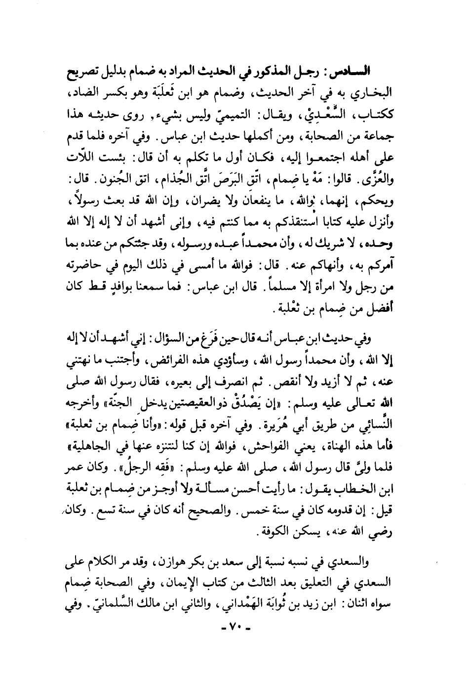 والسعدي في نسبه نسبة إلى سعد بن بكر هوازن، وقد مر الكلام على السعدي في التعليق بعد الثالث من كتاب الإِيمان، وفي الصحابة ضِمام سواه اثنان: ابن زيد بن ثُوابَة الهَمْداني، والثاني ابن مالك السَّلمانيّ. وفي