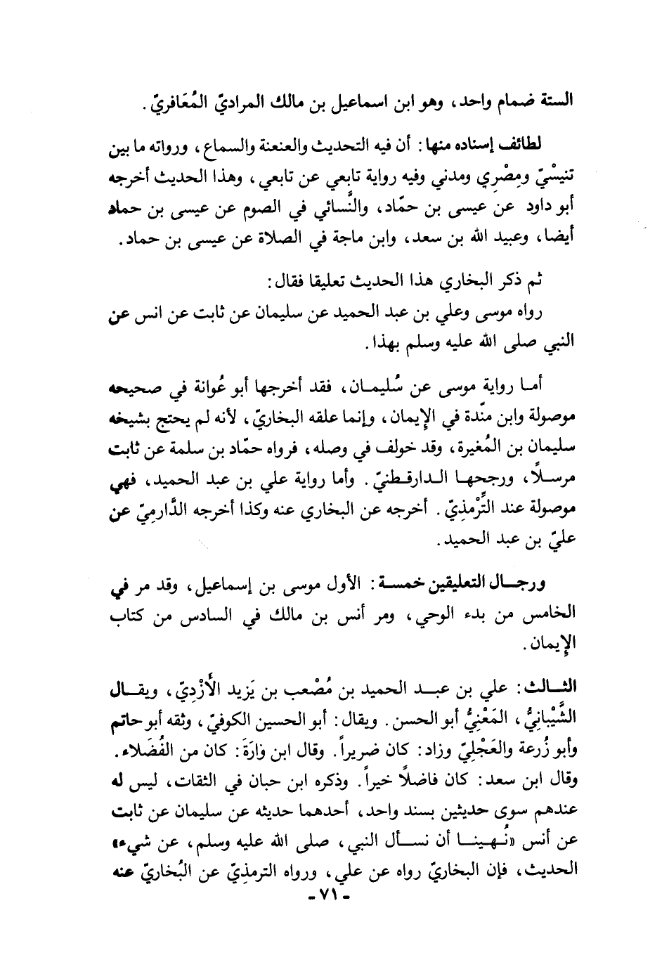 أما رواية موسى عن سُليمان، فقد أخرجها أبو عُوانة في صحيحه موصولة وابن منّدة في الإيمان، وإنما علقه البخاريّ، لأنه لم يحتج بشيخه سليمان بن المُغيرة، وقد خولف في وصله، فرواه حمّاد بن سلمة عن ثابت مرسلًا، ورجحها الدارقطنيّ. وأما رواية علي بن عبد الحميد، فهي موصولة عند التِّرْمذِيّ. أخرجه عن البخاري عنه وكذا أخرجه الدَّارمِيّ عن عليّ بن عبد الحميد.