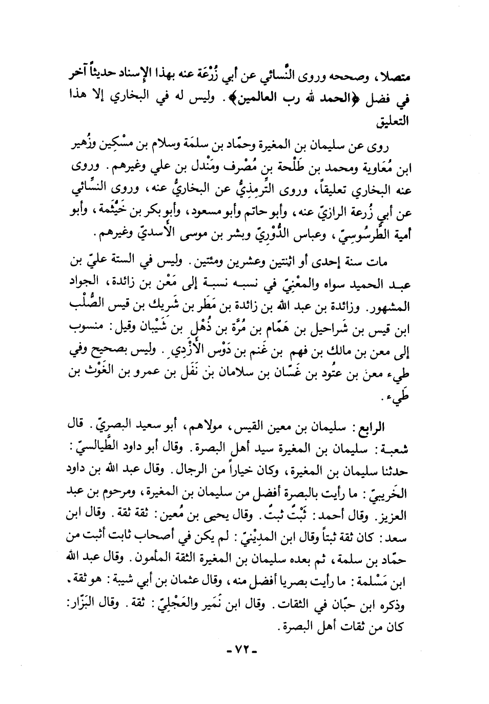 الرابع: سليمان بن معين القيس، مولاهم، أبو سعيد البصريّ. قال شعبة: سليمان بن المغيرة سيد أهل البصرة. وقال أبو داود الطَّيالسيّ: حدثنا سليمان بن المغيرة، وكان خيارًا من الرجال. وقال عبد الله بن داود الخَريبيّ: ما رأيت بالبصرة أفضل من سليمان بن المغيرة، ومرحوم بن عبد العزيز. وقال أحمد: ثَبْتٌ ثبتٌ. وقال يحيى بن مُعين: ثقة ثقة. وقال ابن سعد: كان ثقة ثبتًا وقال ابن المدِيْنيّ: لم يكن في أصحاب ثابت أثبت من حمّاد بن سلمة، ثم بعده سليمان بن المغيرة الثقة المأمون. وقال عبد الله ابن مَسْلمة: ما رأيت بصريا أفضل منه، وقال عثمان بن أبي شيبة: هو ثقة وذكره ابن حبّان في الثقات. وقال ابن نُمَير والعَجْلِيّ: ثقة. وقال البَزّار: كان من ثقات أهل البصرة.