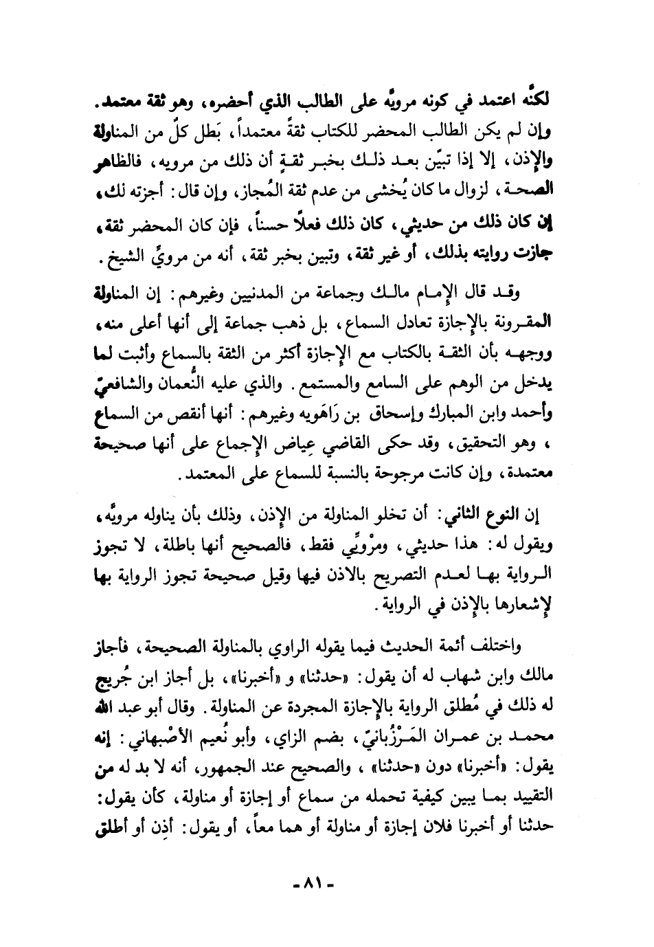إن النوع الثاني: أن تخلو المناولة من الإذن، وذلك بأن يناوله مرويَّه، ويقول له: هذا حديثي، ومرْويِّي فقط، فالصحيح أنها باطلة، لا تجوز الرواية بها لعدم التصريح بالاذن فيها وقيل صحيحة تجوز الرواية بها لإِشعارها بالإِذن في الرواية.