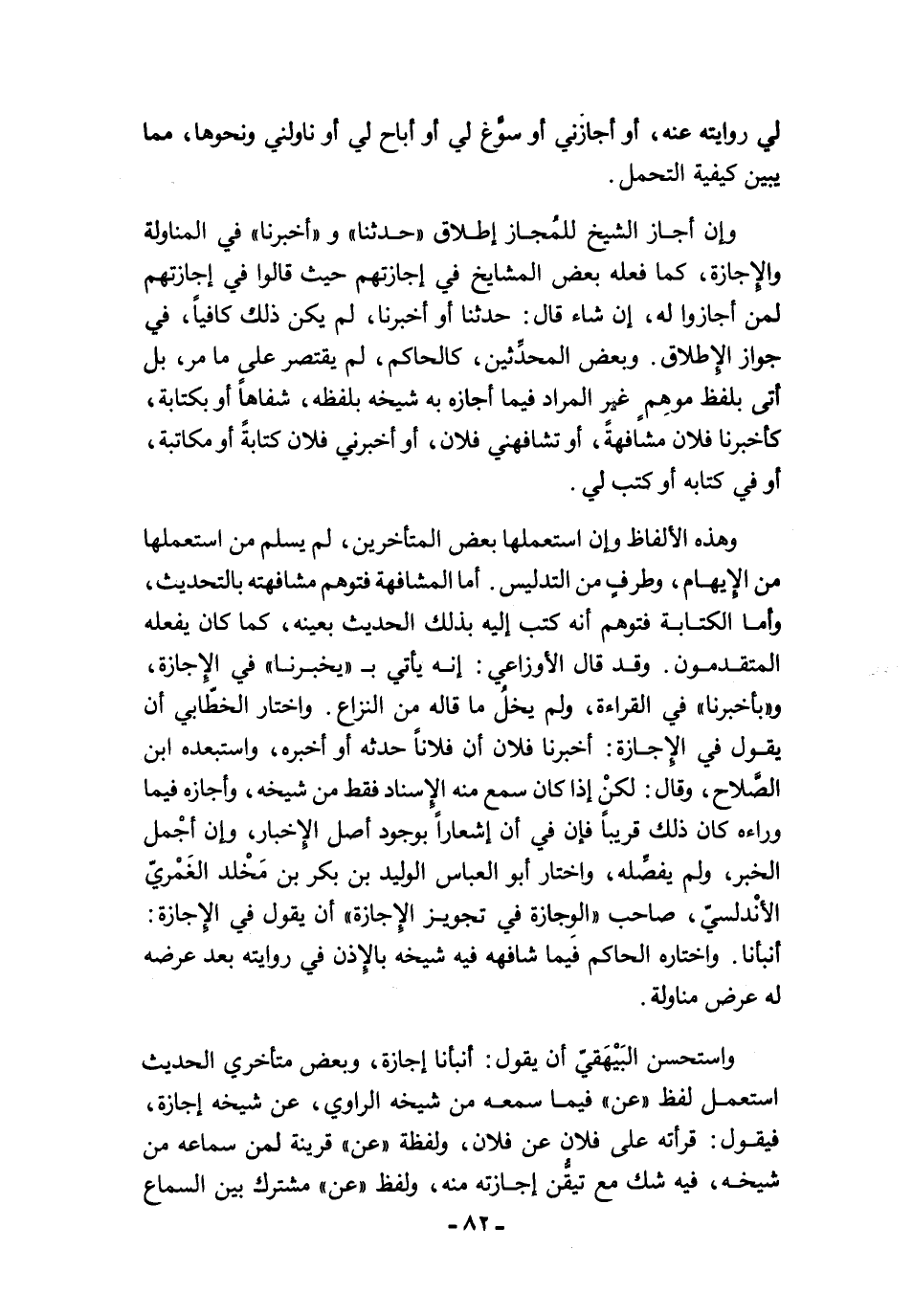 واستحسن البَيْهَقيّ أن يقول: أنبأنا إجازة، وبعض متأخري الحديث استعمل لفظ "عن" فيما سمعه من شيخه الراوي، عن شيخه إجازة، فيقول: قرأته على فلان عن فلان، ولفظة "عن" قرينة لمن سماعه من شيخه، فيه شك مع تيقُّن إجازته منه، ولفظ "عن" مشترك بين السماع
