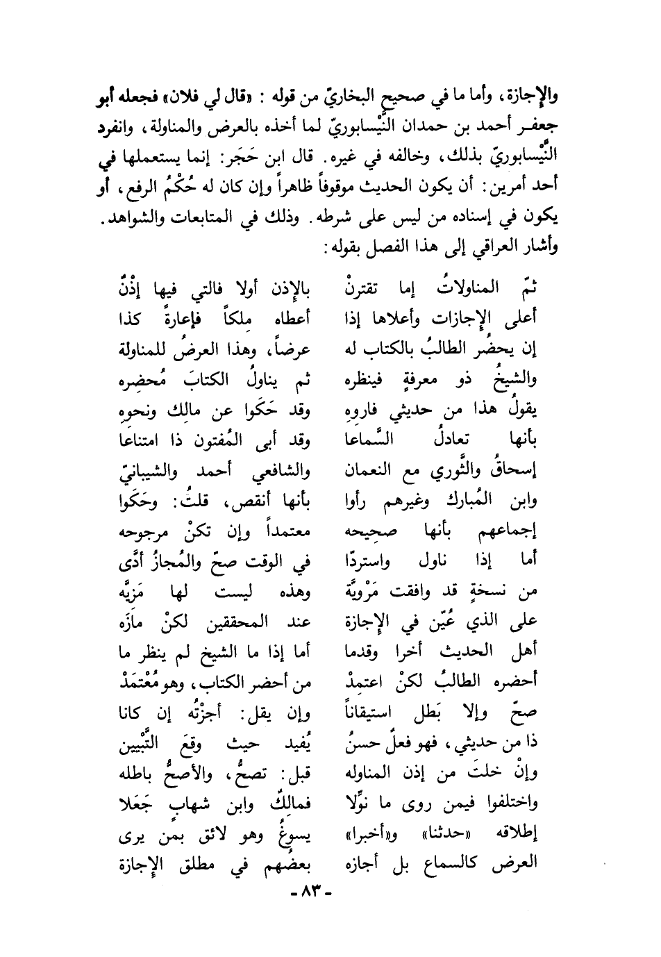 والإِجازة، وأما ما في صحيح البخاريّ من قوله: "قال لي فلان" فجعله أبو جعفر أحمد بن حمدان النَّيْسابوريّ لما أخذه بالعرض والمناولة، وانفرد النَّيْسابوريّ بذلك، وخالفه في غيره. قال ابن حَجَر: إنما يستعملها في أحد أمرين: أن يكون الحديث موقوفًا ظاهرًا وإن كان له حُكْمُ الرفع، أو يكون في إسناده من ليس على شرطه. وذلك في المتابعات والشواهد. وأشار العراقي إلى هذا الفصل بقوله: