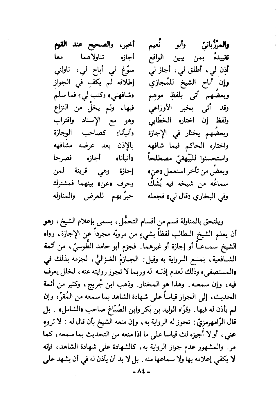 ويلتحق بالمناولة قسم من أقسام التحمُّل، يسمى بإعلام الشيخ، وهو أن يعلم الشيخ الطالب لفظًا بشيءٍ من مرويّه مجردًا عن الإجازة، رواه الشيخ سماعًا أو إجازة أو غيرهما. فجزم أبو حامد الطُّوسيّ، من أئمة الشافعية، بمنع الرواية به وقيل: الجازمُ الغزاليُّ، لجزمه بذلك في "المستصفى" وذلك لعدم إذنه له وربما لا تجوز روايته عنه، لخلل يعرف فيه، وإن سمعه. وهذا هو المختار. وذهب ابن جُريج، وكثير من أئمة الحديث، إلى الجواز قياسًا على شهادة الشاهد بما سمعه من المُقرّ، وإن لم يأذن له فيها. وقوّاه الوليد بن بَكر وابن الصَّبّاغ صاحب "الشامل". بل قال الرّامهرمزيّ: تجوز له الرواية به، وإن منعه الشيخ بأن قال له: لا تروهِ عني، أو لا أُجيزه لك قياسا على ما إذا منعه من التحديث بما سمعه، كما مر. والمشهور عدم جواز الرواية به، كالشهادة على شهادة الشاهد، فإنه لا يكفي إعلامه بها ولا سماعها منه. بل لابد أن يأذن له في أن يشهد على