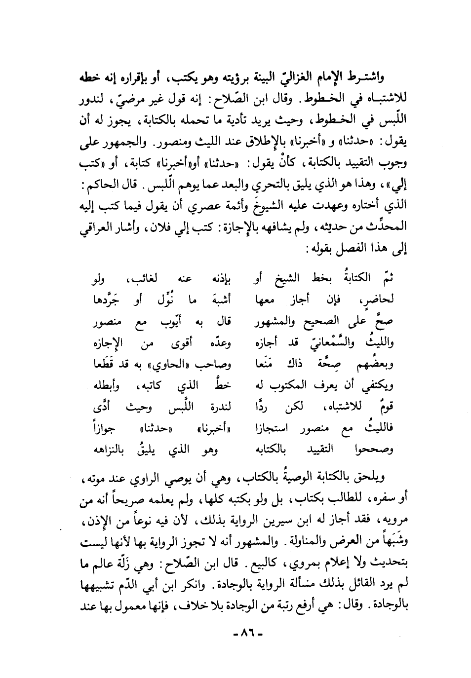 واشترط الإِمام الغزاليّ البينة برؤيته وهو يكتب، أو بإقراره إنه خطه للاشتباه في الخطوط. وقال ابن الصّلاح: إنه قول غير مرضيّ، لندور اللّبس في الخطوط، وحيث يريد تأدية ما تحمله بالكتابة، يجوز له أن يقول: "حدثنا" و"أخبرنا" بالإِطلاق عند الليث ومنصور. والجمهور على وجوب التقييد بالكتابة، كأنْ يقول: "حدثنا" أو "أخبرنا" كتابة، أو "كتب إلى"، وهذا هو الذي يليق بالتحري والبعد عما يوهم الّلبس. قال الحاكم: الذي أختاره وعهدت عليه الشيوخَ وأئمة عصري أن يقول فيما كتب إليه المحدِّث من حديثه، ولم يشافهه بالإِجازة: كتب إلى فلان، وأشار العراقي إلى هذا الفصل بقوله: