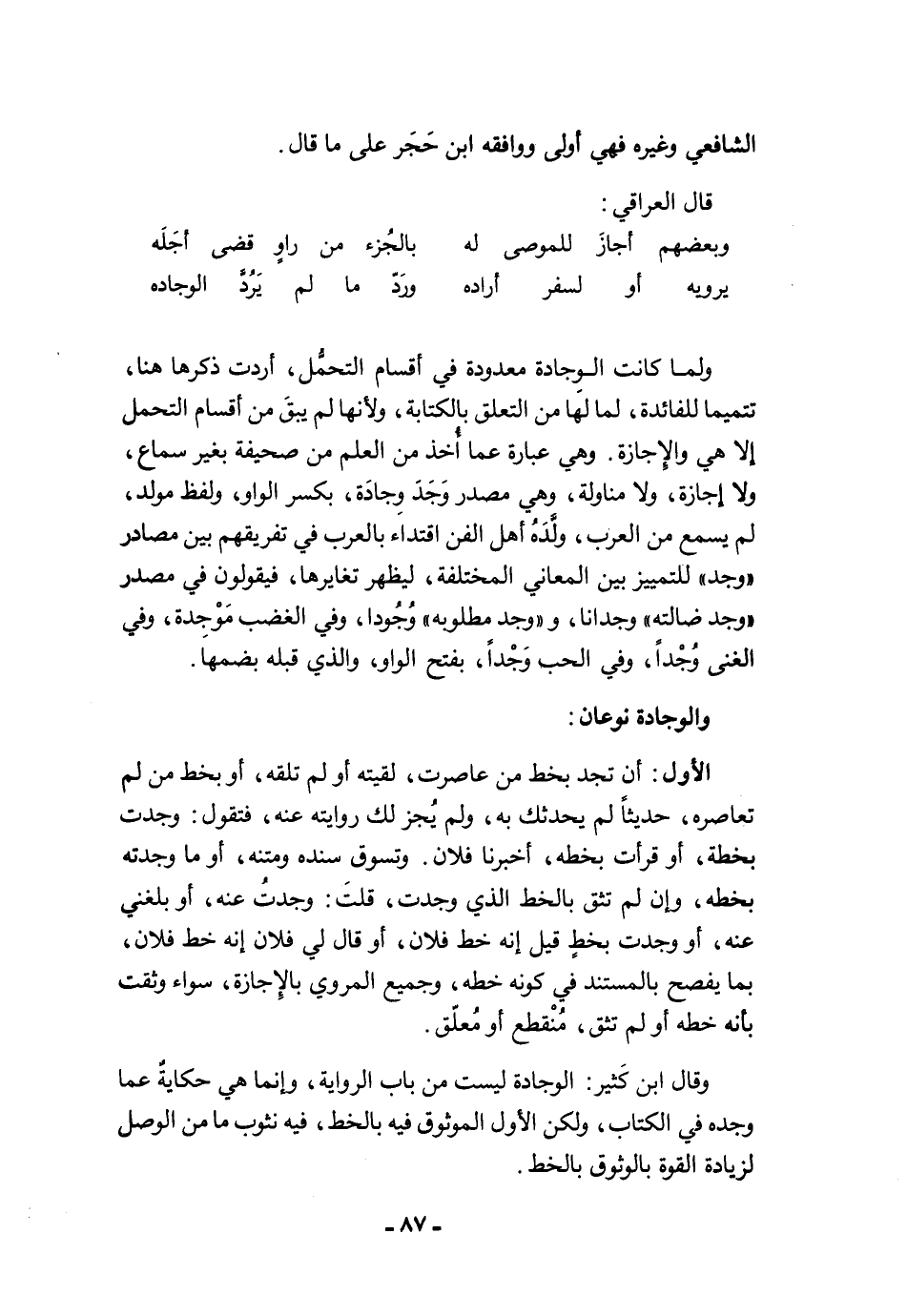 الأول: أن تجد بخط من عاصرت، لقيته أو لم تلقه، أو بخط من لم تعاصره، حديثًا لم يحدثك به، ولم يُجز لك روايته عنه، فتقول: وجدت بخطة، أو قرأت بخطه، أخبرنا فلان. وتسوق سنده ومتنه، أو ما وجدته بخطه، وإن لم تثق بالخط الذي وجدت، قلتَ: وجدتُ عنه، أو بلغني عنه، أو وجدت بخطٍ قيل إنه خط فلان، أو قال لي فلان إنه خط فلان، بما يفصح بالمستند في كونه خطه، وجميع المروي بالإِجازة، سواء وثقت بأنه خطه أو لم تثق، مُنْقطع أو مُعلّق.