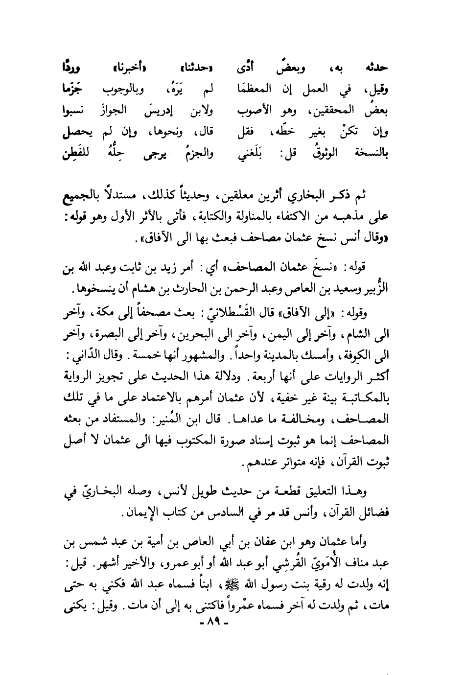 ثم ذكر البخاري أثرين معلقين، وحديثًا كذلك، مستدلًا بالجميع على مذهبه من الاكتفاء بالمناولة والكتابة، فأتى بالأثر الأول وهو قوله: "وقال أنس نسخ عثمان مصاحف فبعث بها إلى الآفاق".