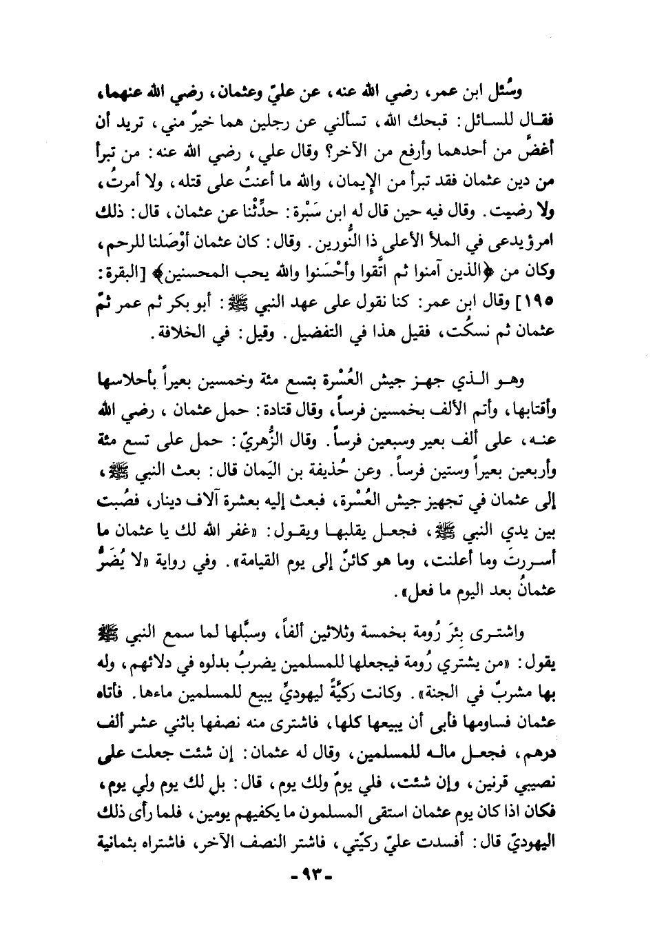 وسُئل ابن عمر، رضي الله عنه، عن عليّ وعثمان، رضي الله عنهما، فقال للسائل: قبحك الله، تسألني عن رجلين هما خيرٌ مني، تريد أن أغضَّ من أحدهما وأرفع من الآخر؟ وقال علي، رضي الله عنه: من تبرأ من دين عثمان فقد تبرأ من الإِيمان، والله ما أعنتُ على قتله، ولا أمرتُ، ولا رضيت. وقال فيه حين قال له ابن سَبْرة: حدِّثْنا عن عثمان، قال: ذلك امرؤ يدعى في الملأ الأعلى ذا النُّورين. وقال: كان عثمان أوْصَلنا للرحم، وكان من {الَّذِينَ آمَنُوا وَعَمِلُوا الصَّالِحَاتِ جُنَاحٌ فِيمَا طَعِمُوا إِذَا مَا اتَّقَوْا وَآمَنُوا وَعَمِلُوا الصَّالِحَاتِ ثُمَّ اتَّقَوْا وَآمَنُوا ثُمَّ اتَّقَوْا وَأَحْسَنُوا وَاللَّهُ يُحِبُّ الْمُحْسِنِينَ} [البقرة: 93] وقال ابن عمر: كنا نقول على عهد النبي -صلى الله عليه وسلم-: أبو بكر ثم عمر ثمّ عثمان ثم نسكُت، فقيل هذا في التفضيل. وقيل: في الخلافة.